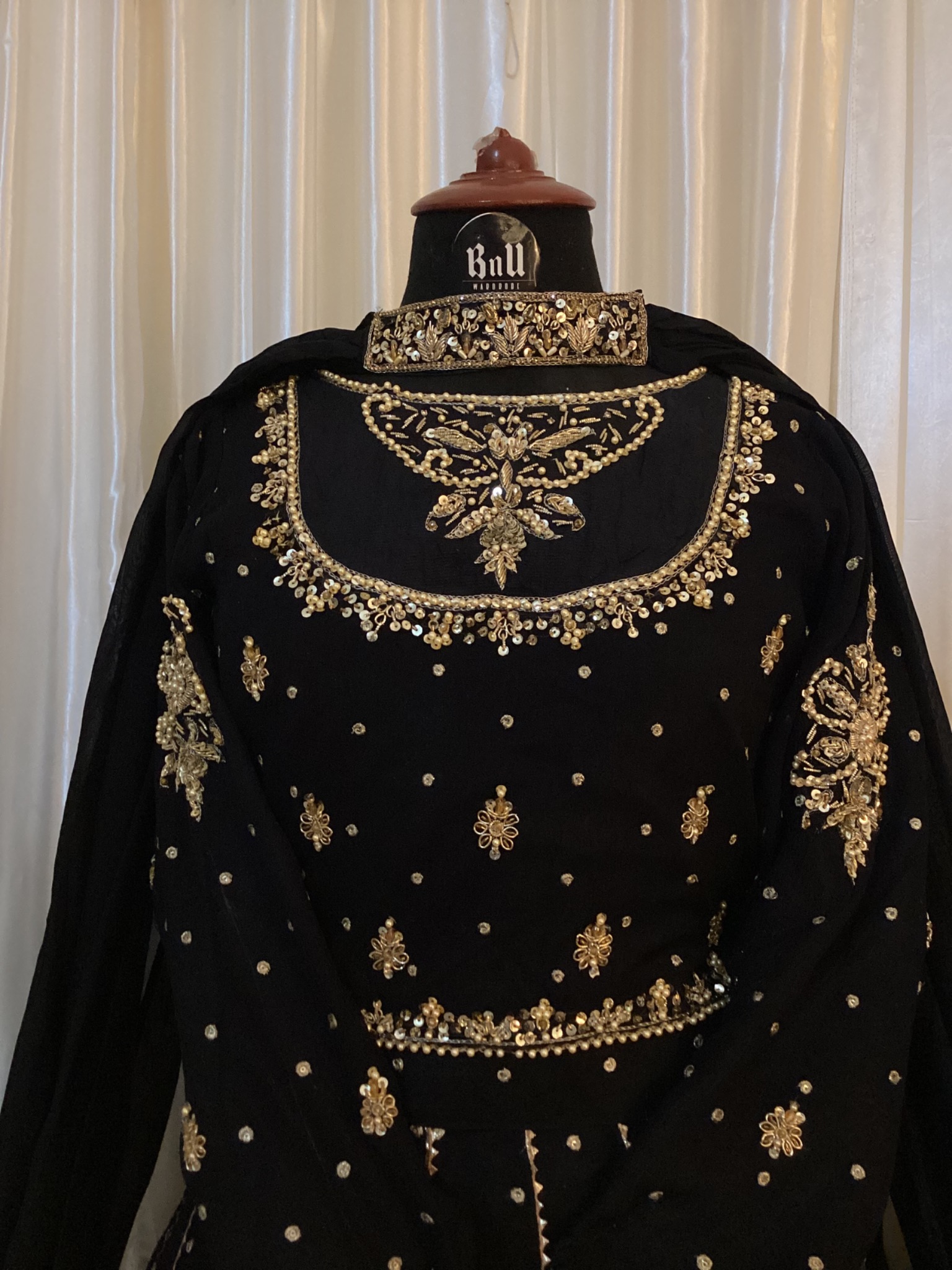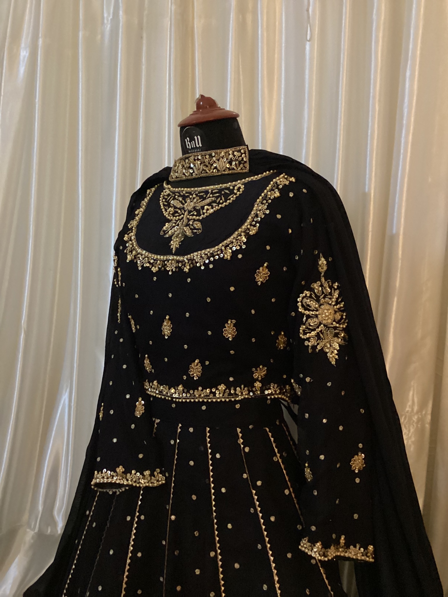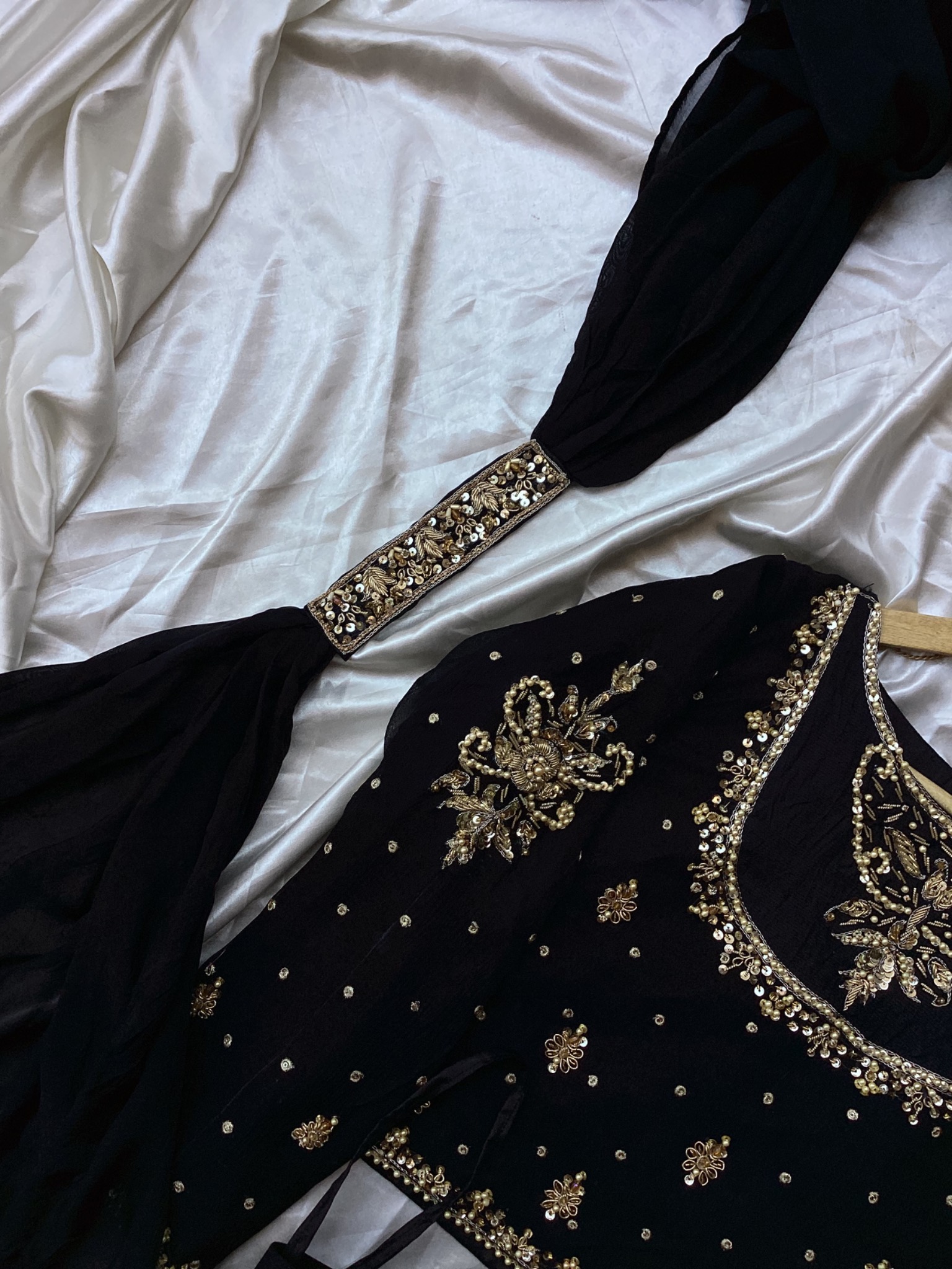 Pure chiffon lehnga choli with hand embellished work on choli and dupata, chiffon lehnga with organza frill, attached cancan and Potli bag