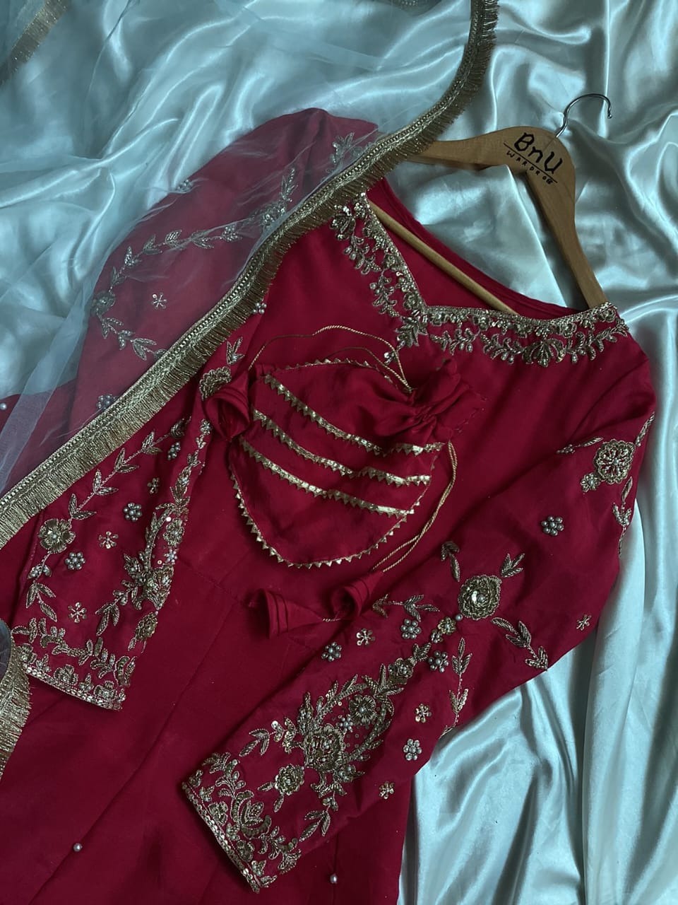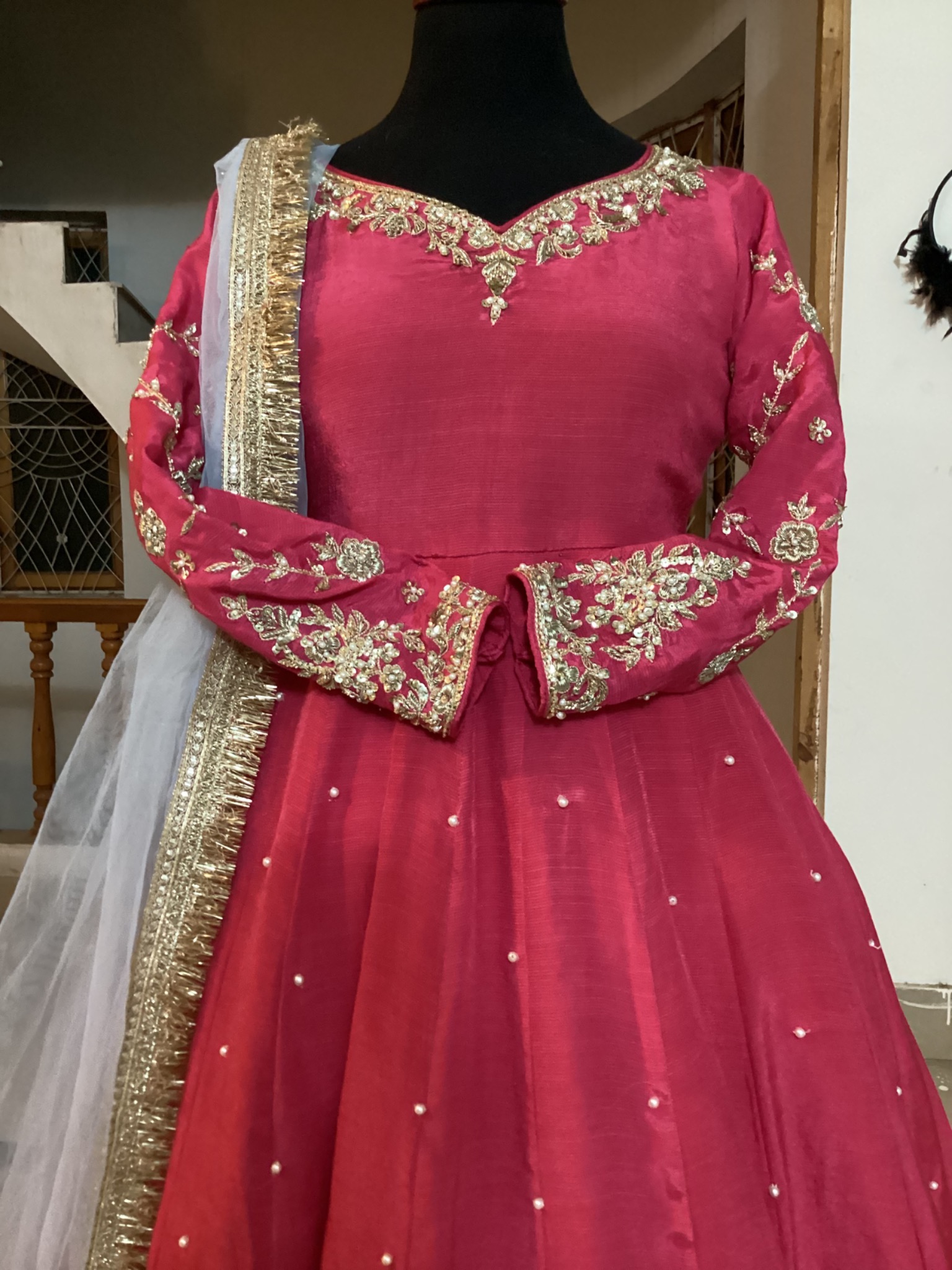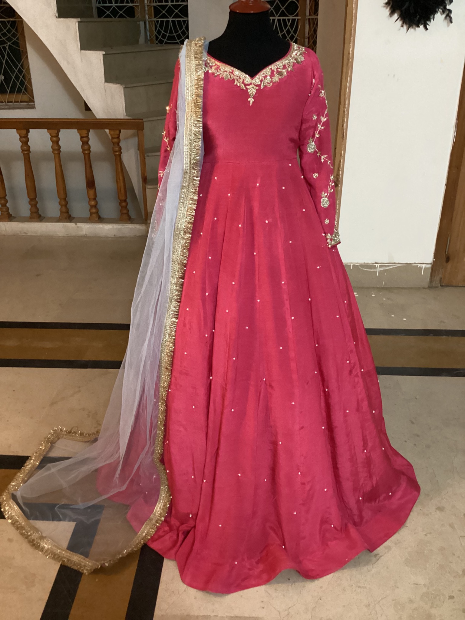 Fabric: Pure Raw Silk fabric with 200-250 inches with hand work on neck and sleeves, attached cancan with Net dupata, Included Potli bag