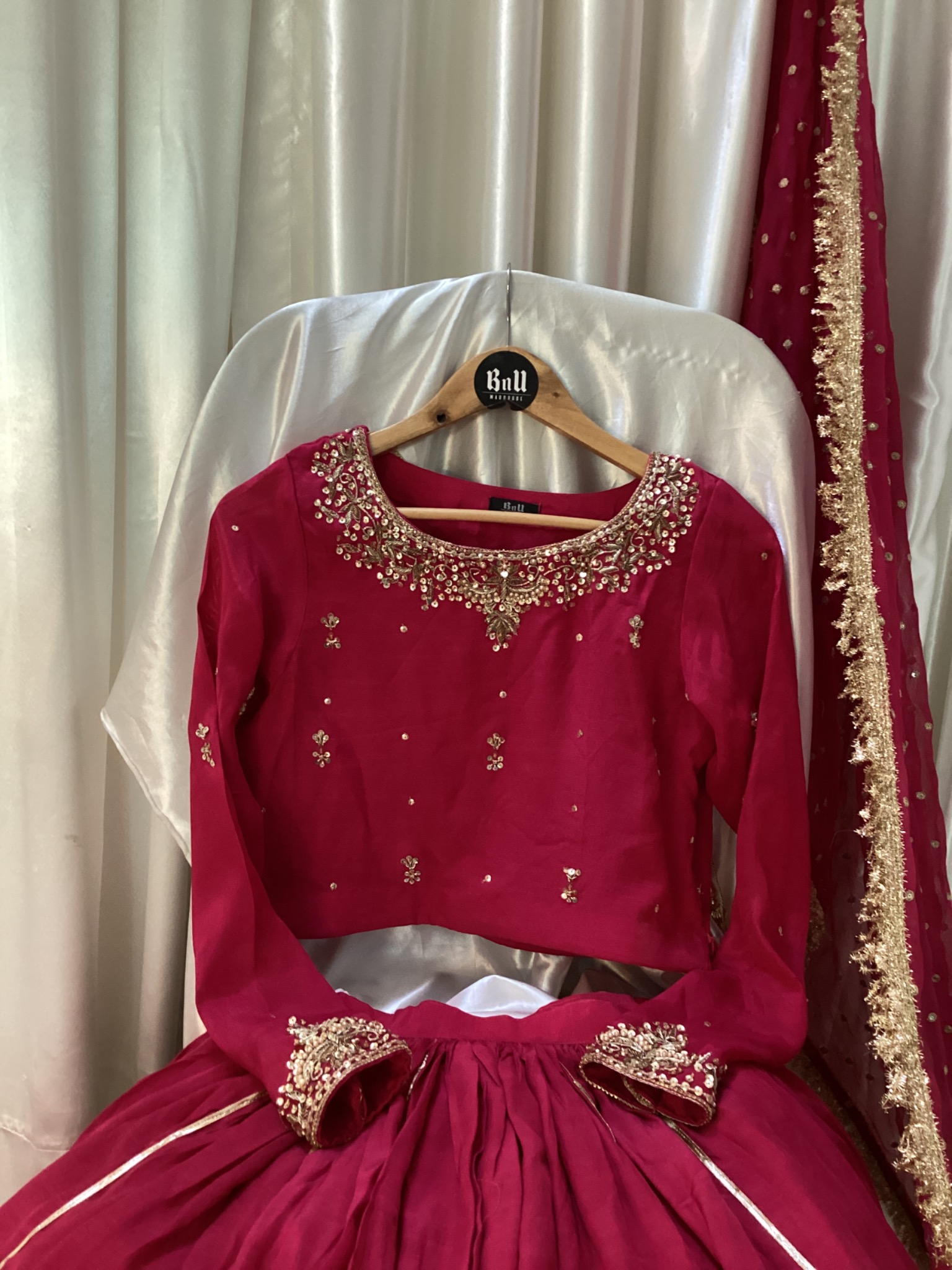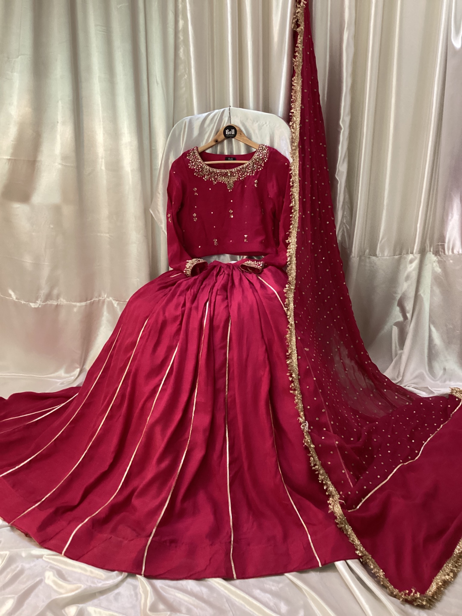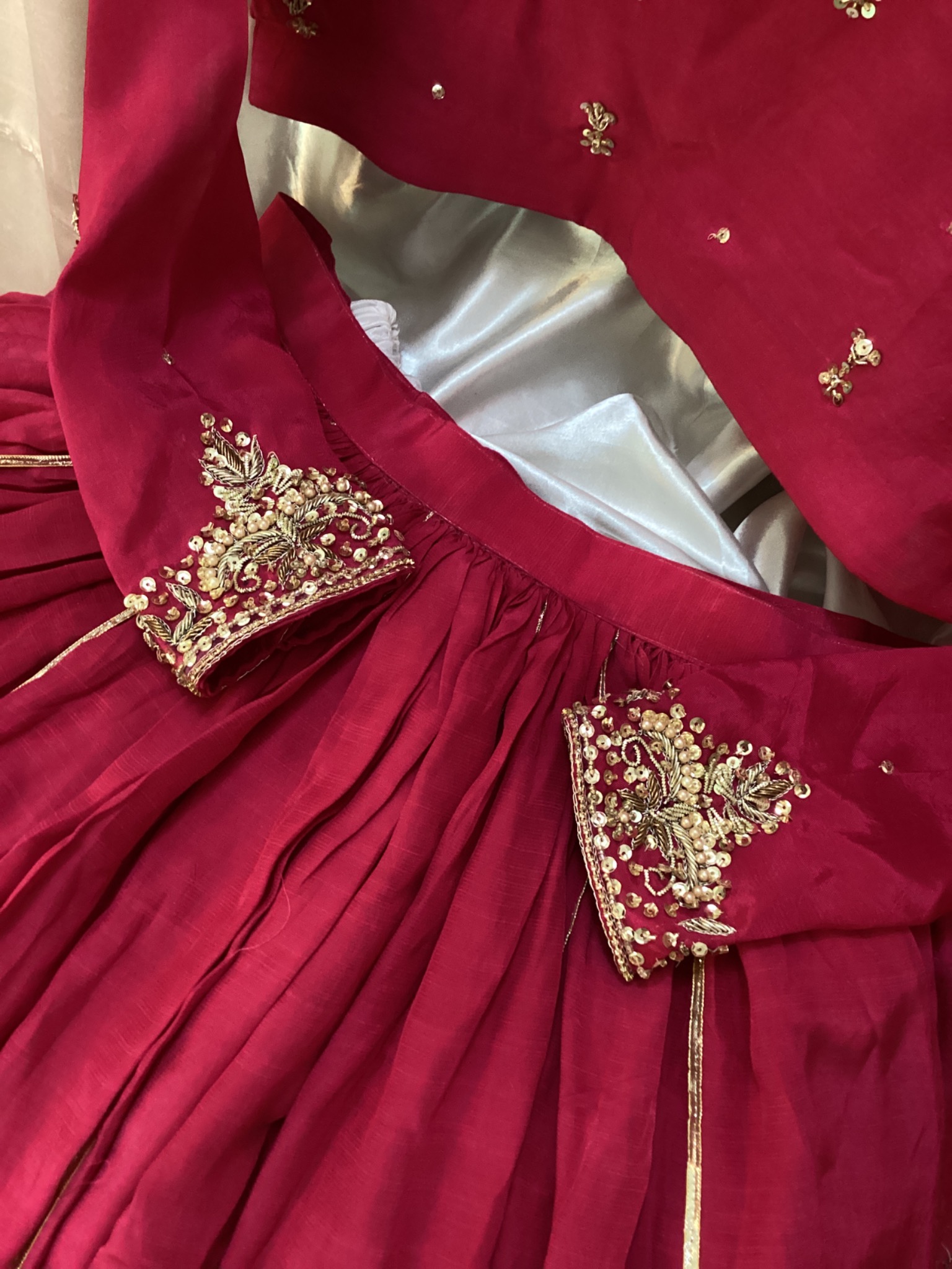Fabric: Pure Raw Silk Lehnga choli made of pure Raw silk fabric with hand embellishment on choli and Dupata is on Pure self embordered chiffon dupata With 300-350 inches flare lehnga with gifted Potli bag and attached Cancan