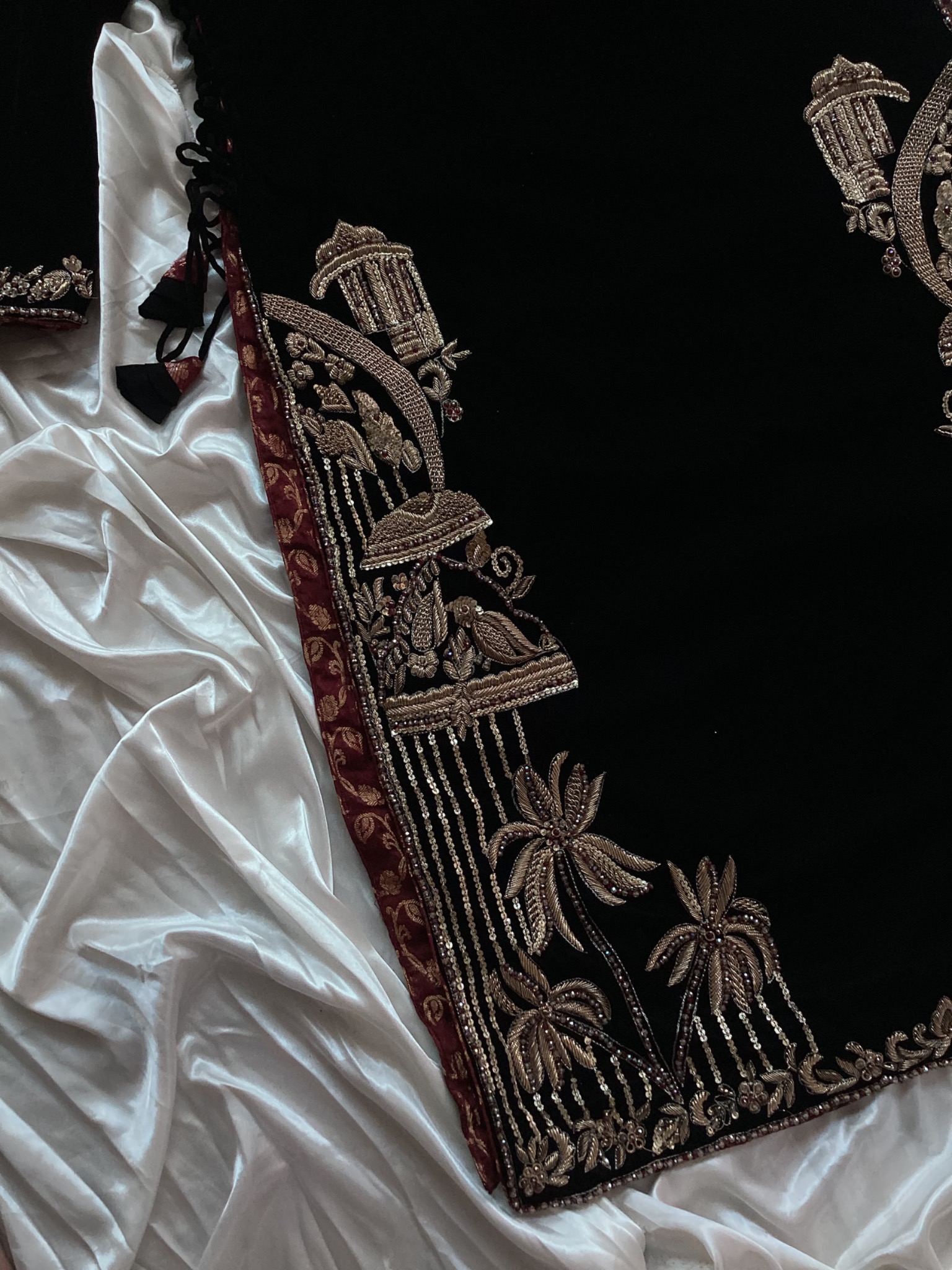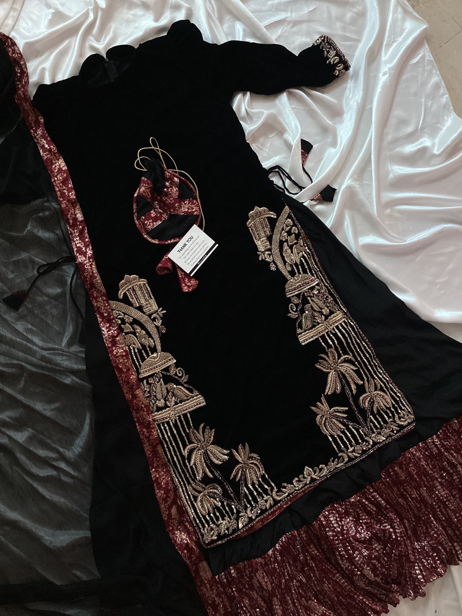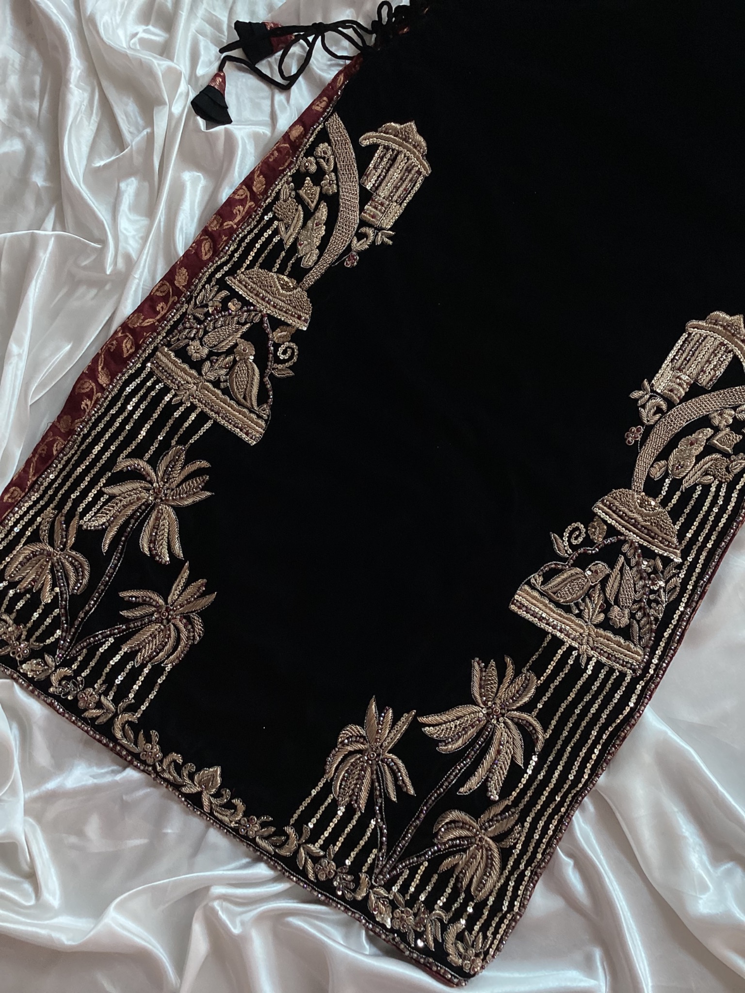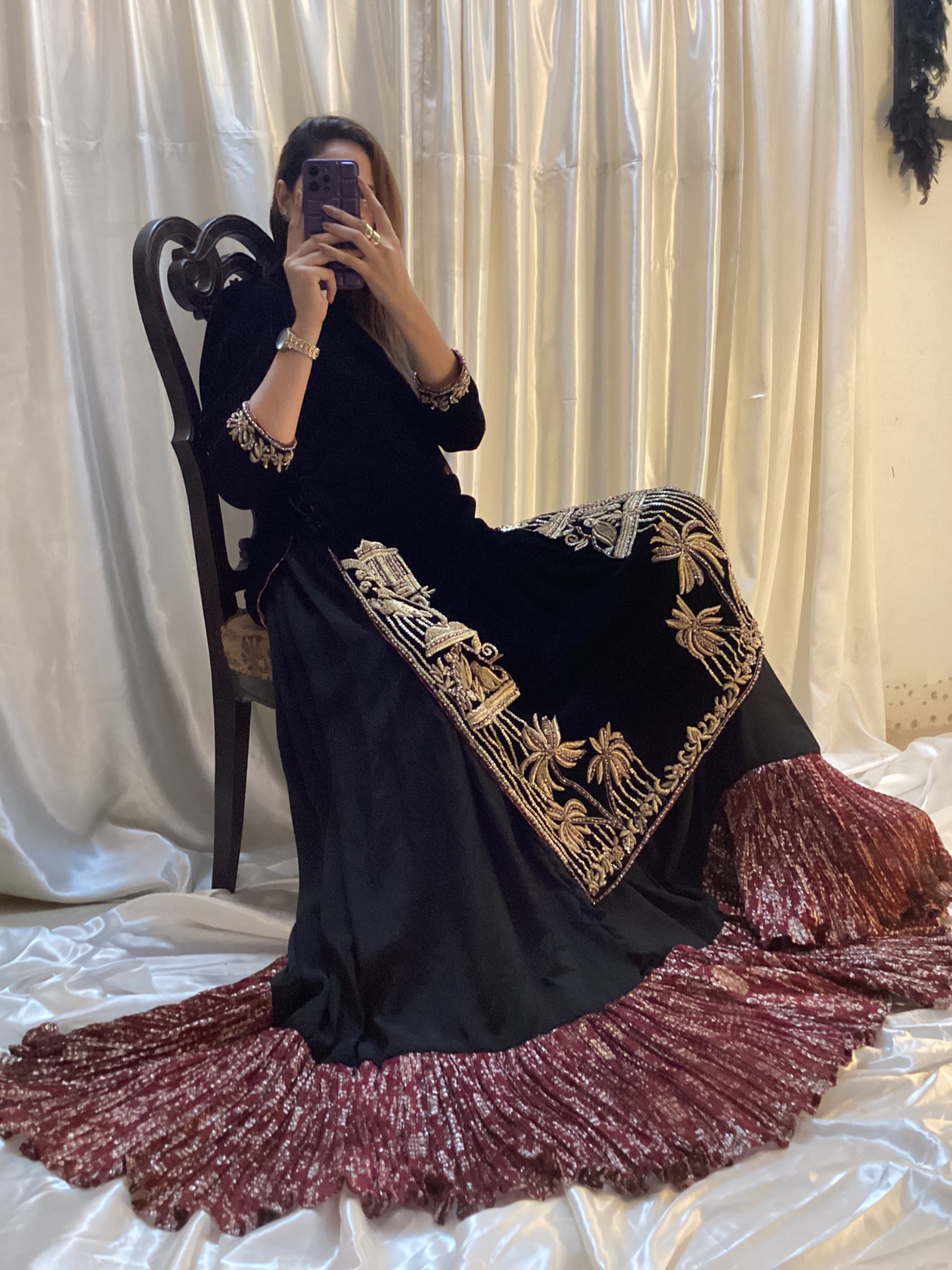 Fabric: Velvet shirt with fully hand embellished work with pure raw silk. Maxi is on pure raw silk with 200-250 inches flare with pure banarsi chiffon frill at the bottom of the maxi flare, trouser with pure raw silk fabric and chiffon dupata included Potli bag