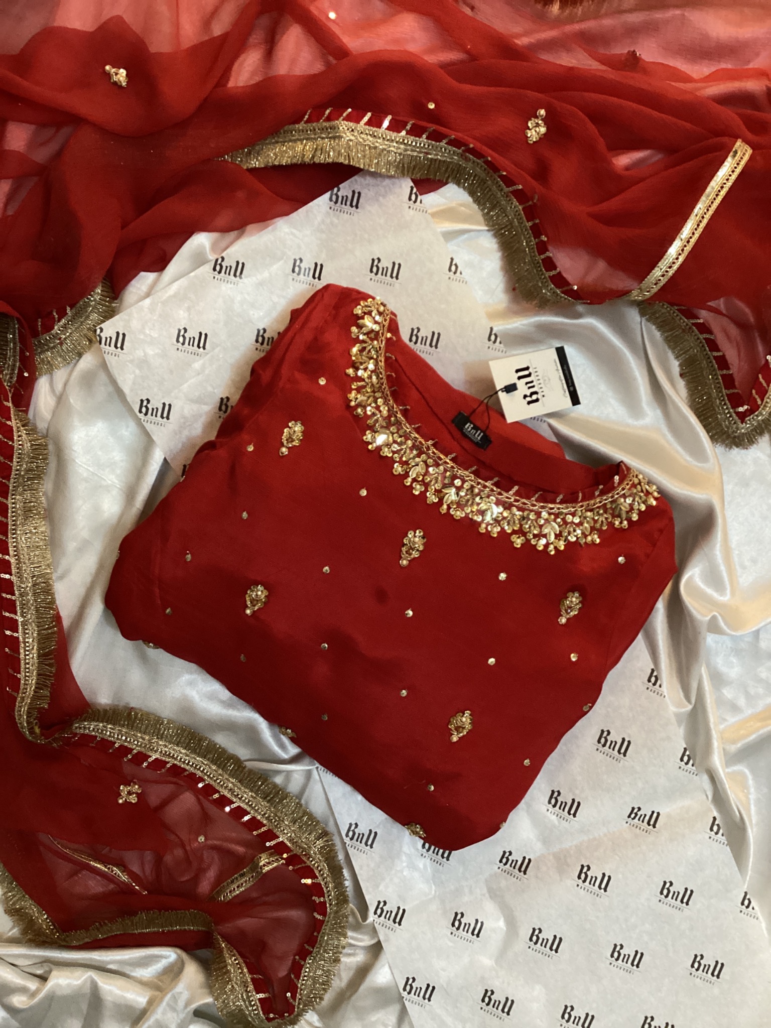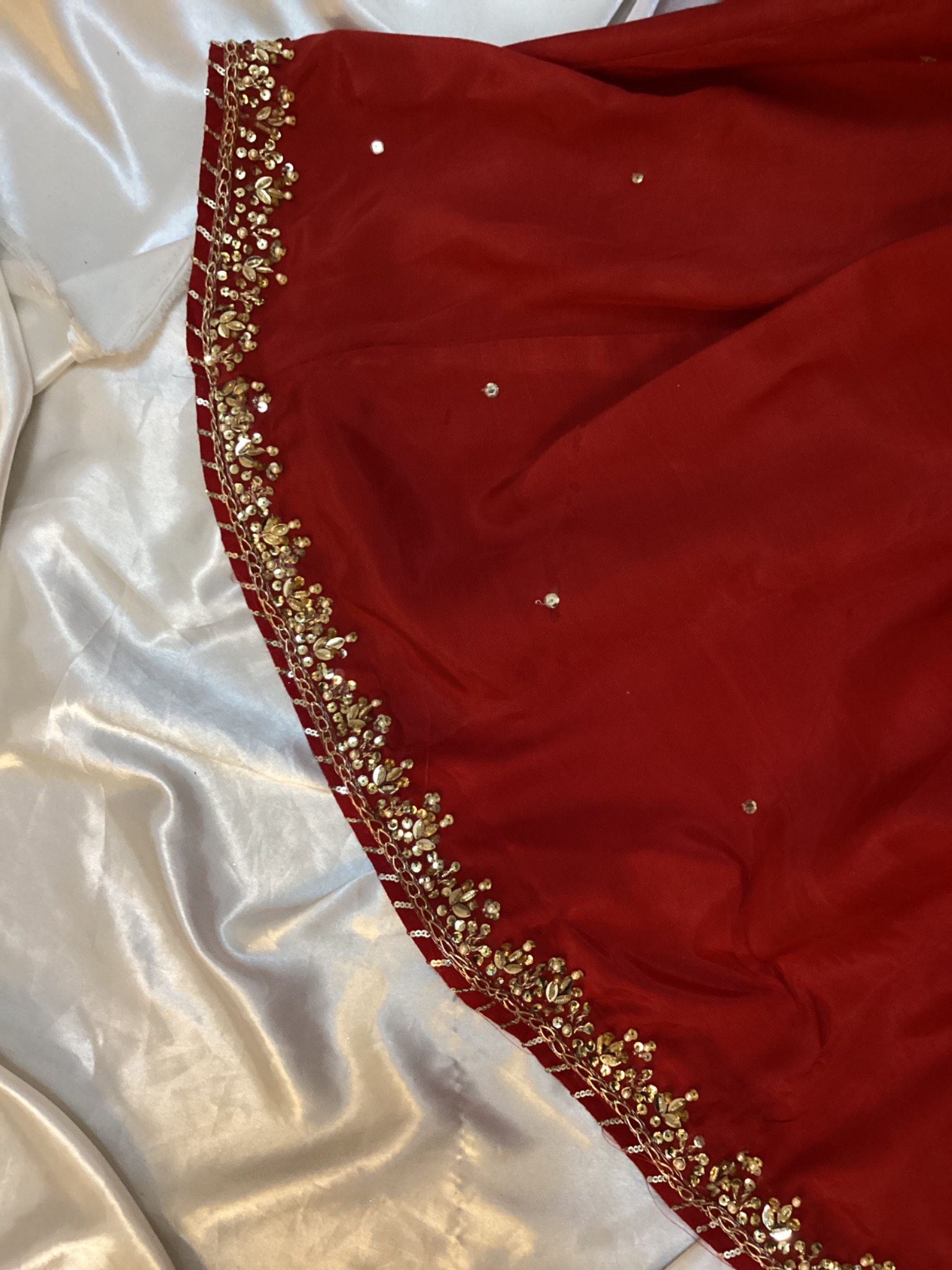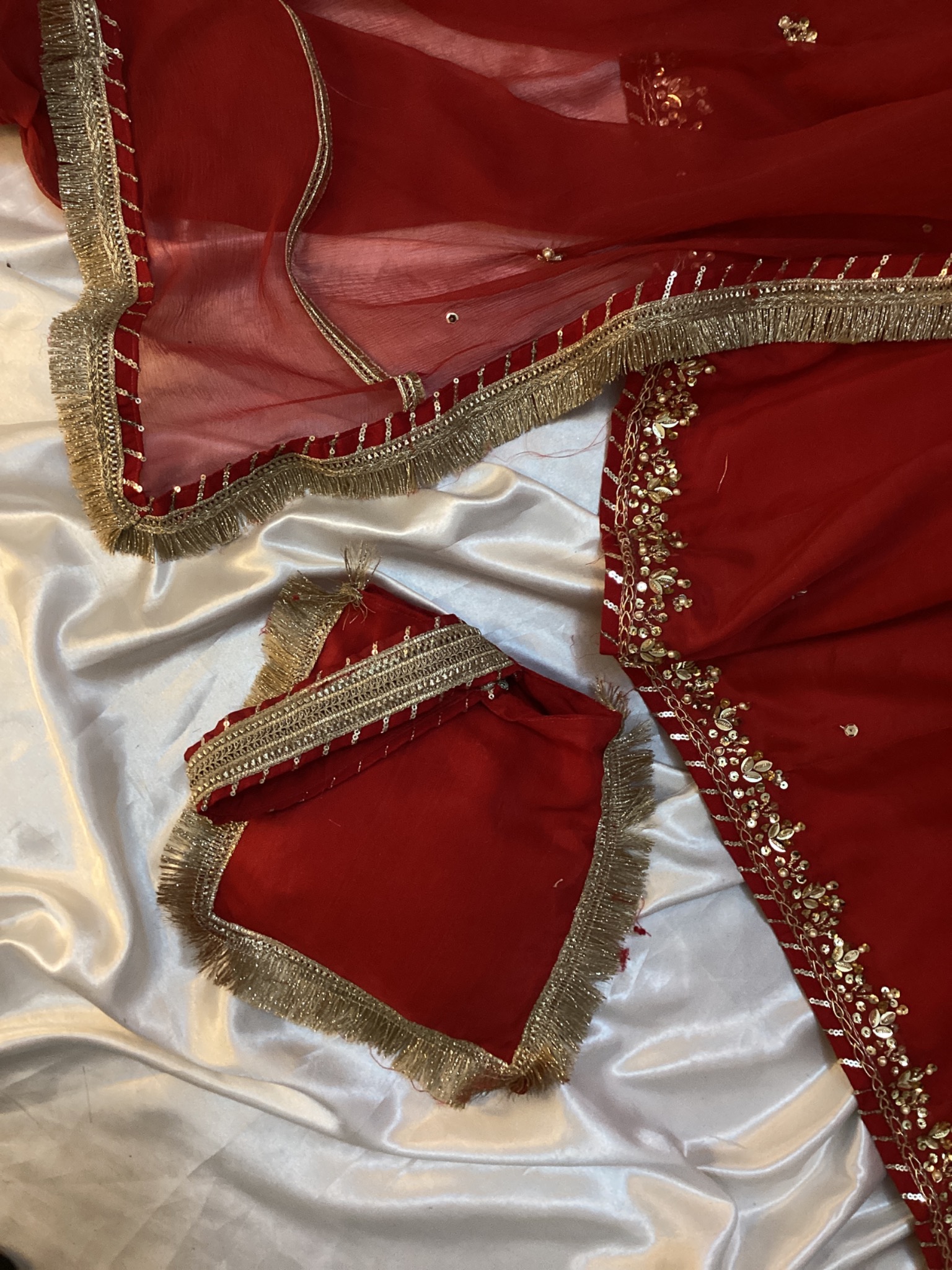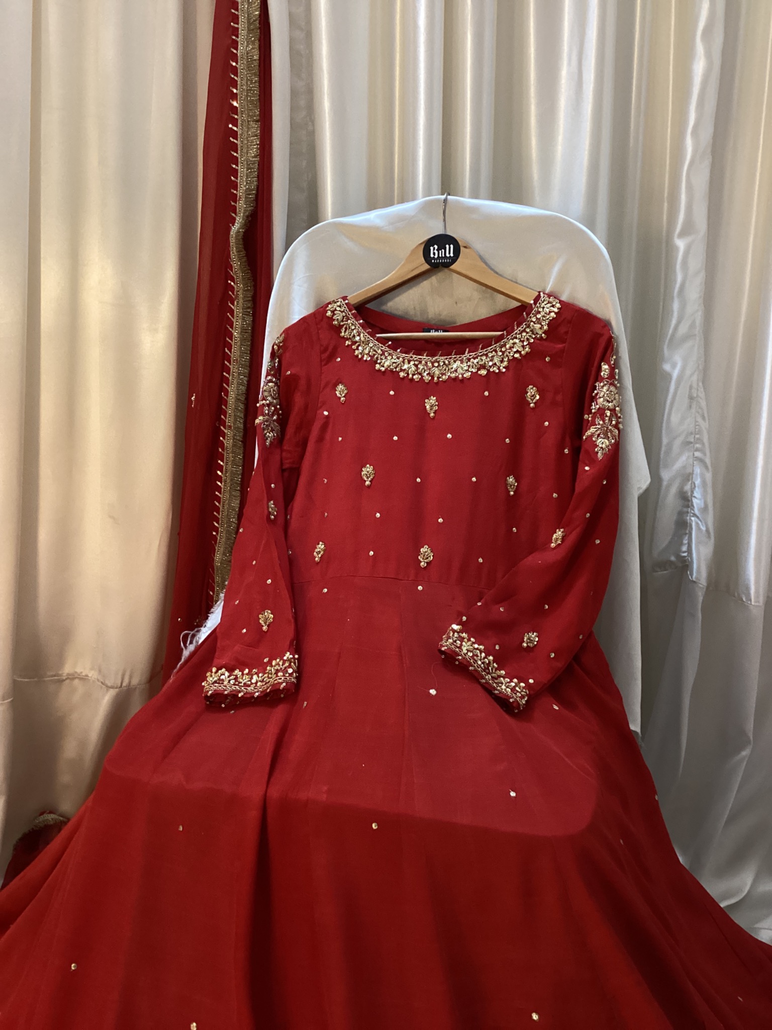 Maxi is on Pure Raw silk fabric with hand embellishment on yoke and flare 250-300 inches Maxi flare with embellished work and with Potli bag and dupata PureChiffon with Hand work