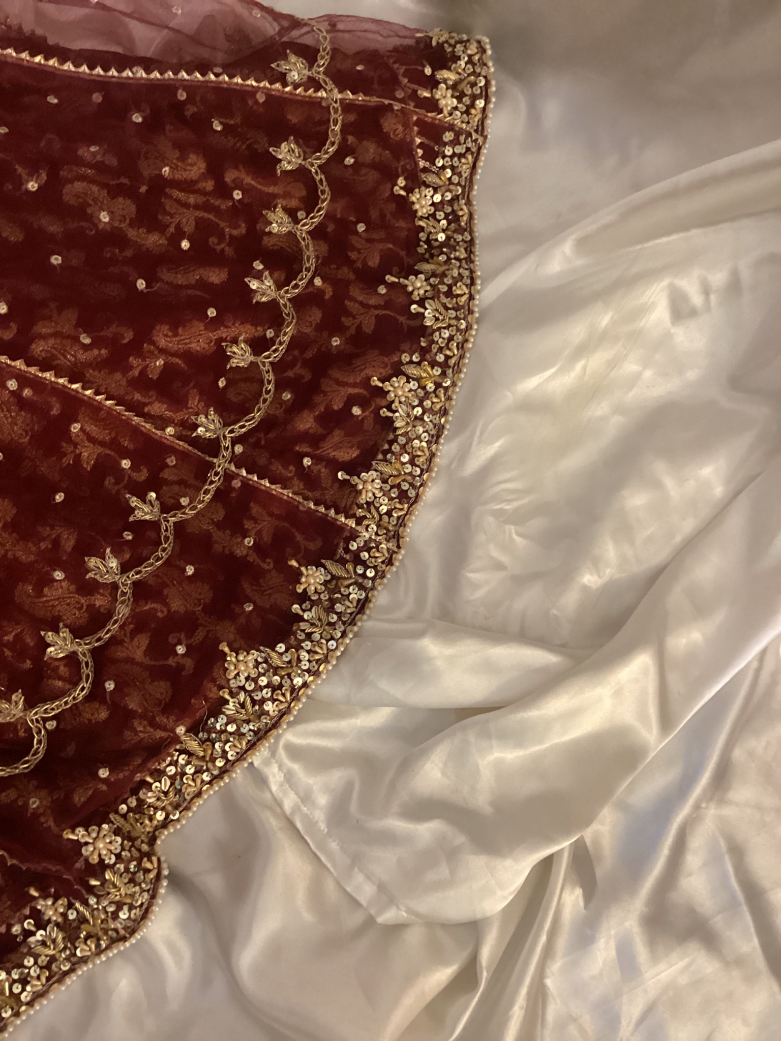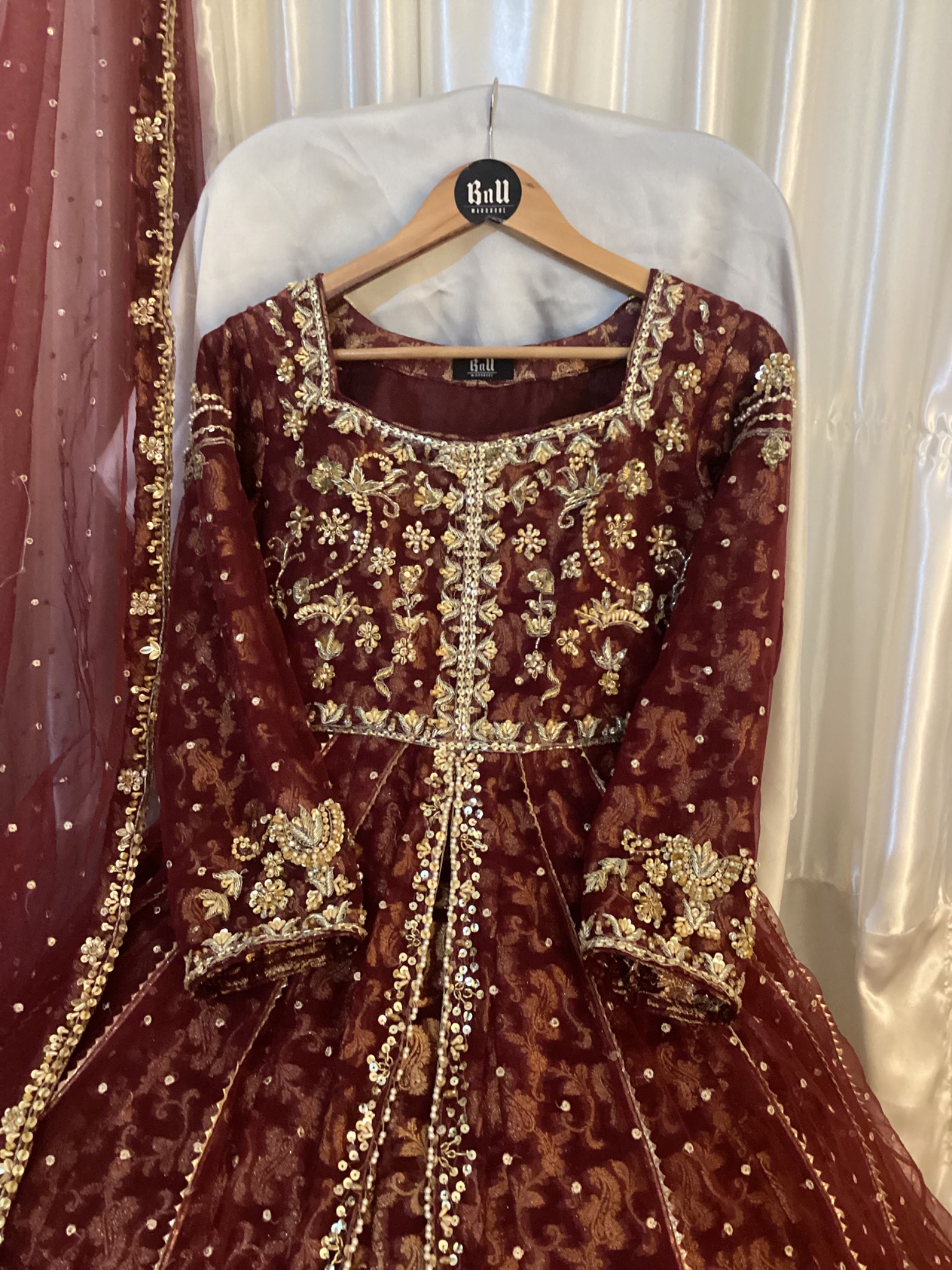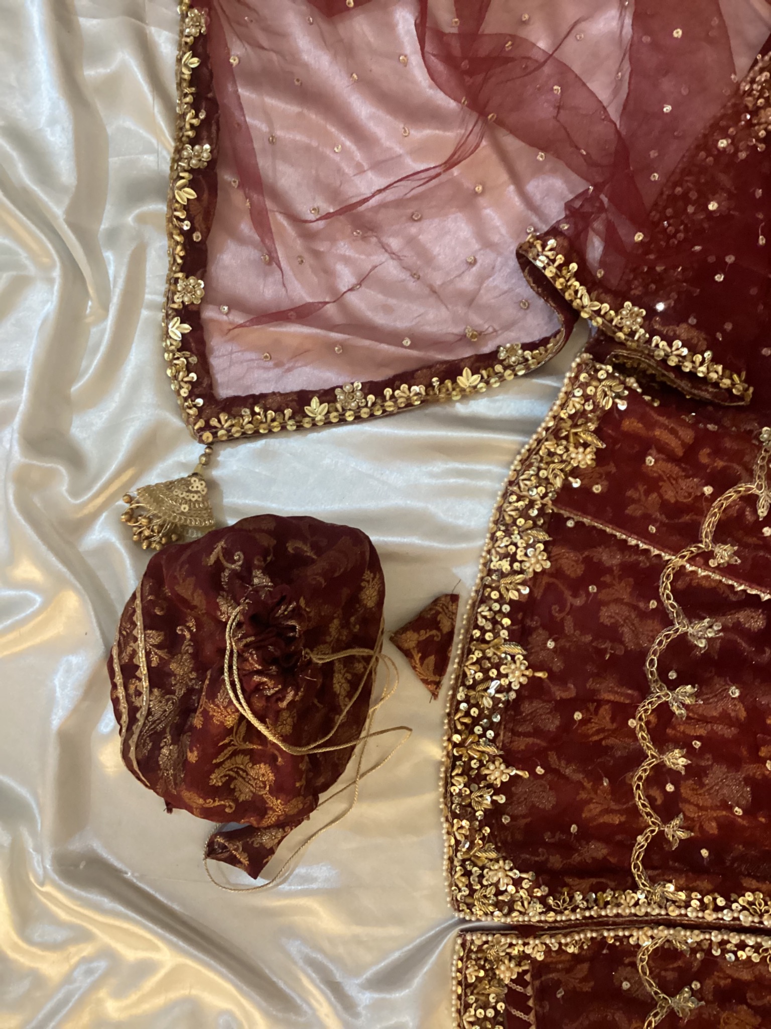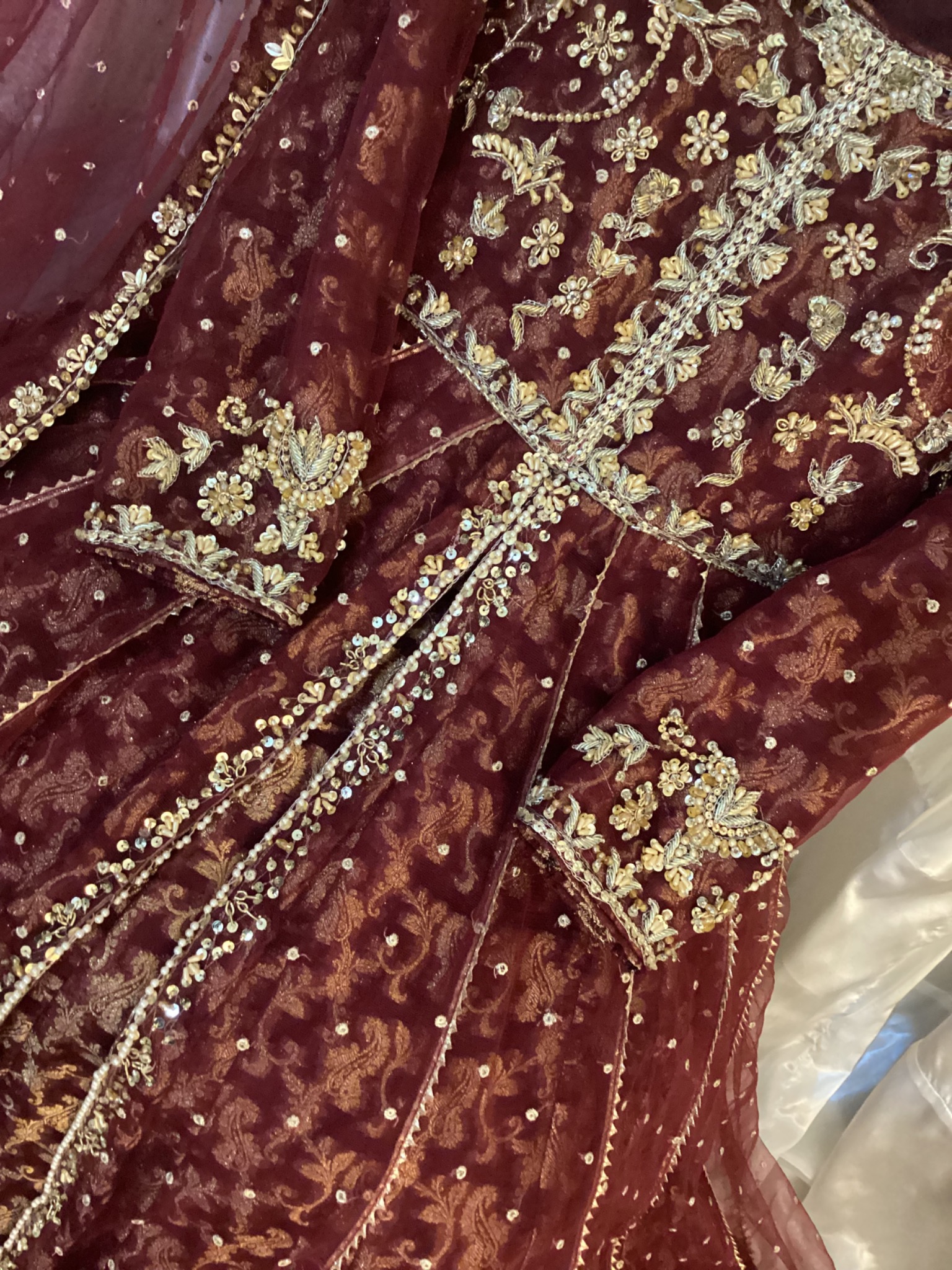Maxi Fabric: Net fabric with hand embellishment on yoke, sleeves and flare with pure banarsi chiffon lining, dupata Net fabric with hand embellishment attached tusselS with separate cancan with Gifted Potli bag