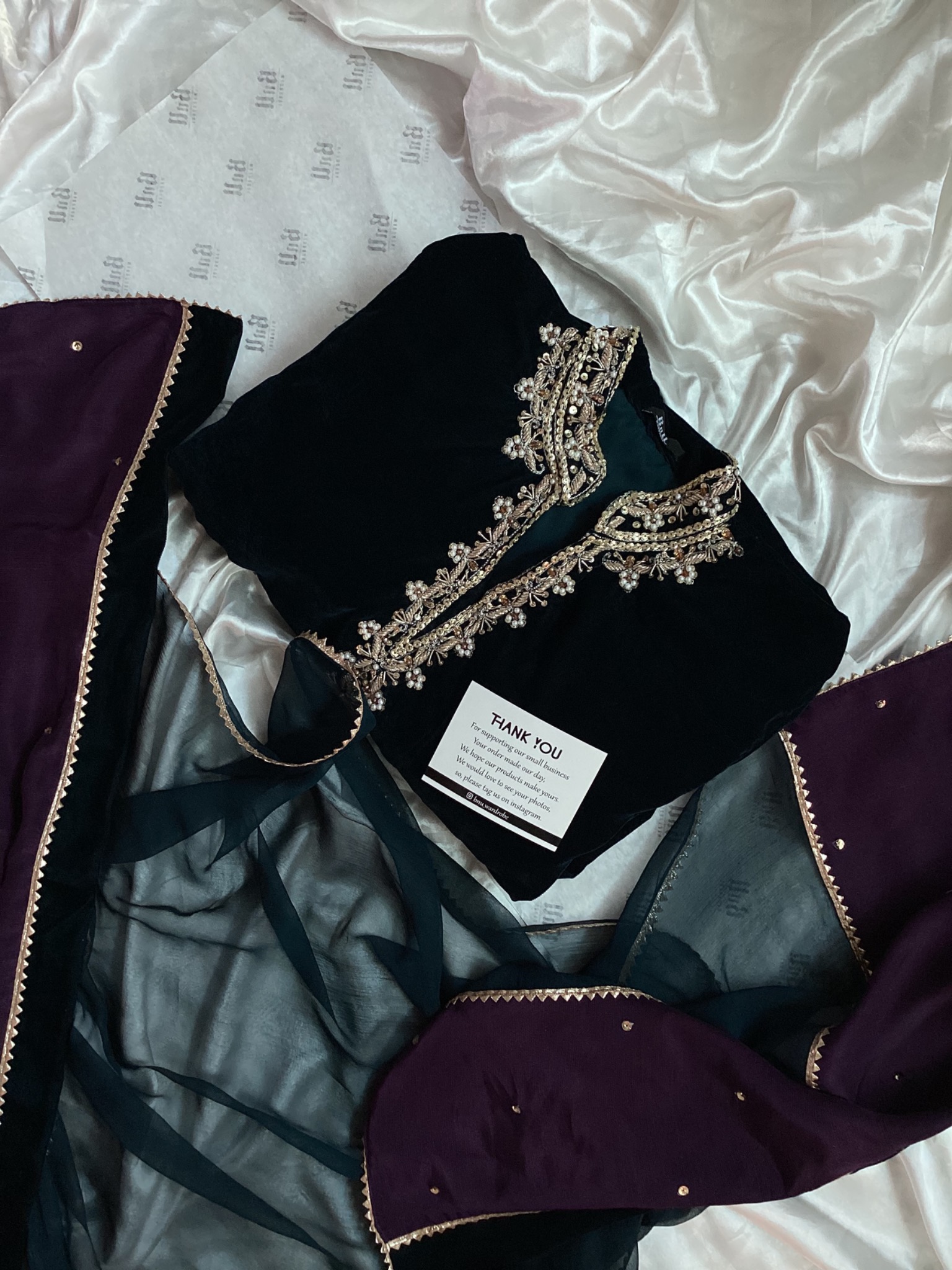 Long velvet shirt with all hand embellishment, pure raw silk trouser with silk dupata.