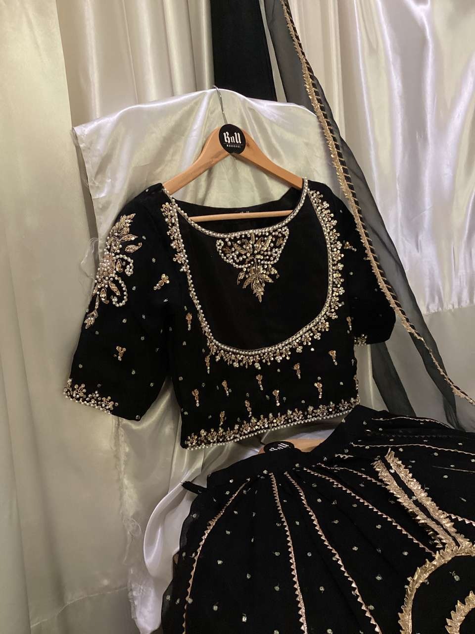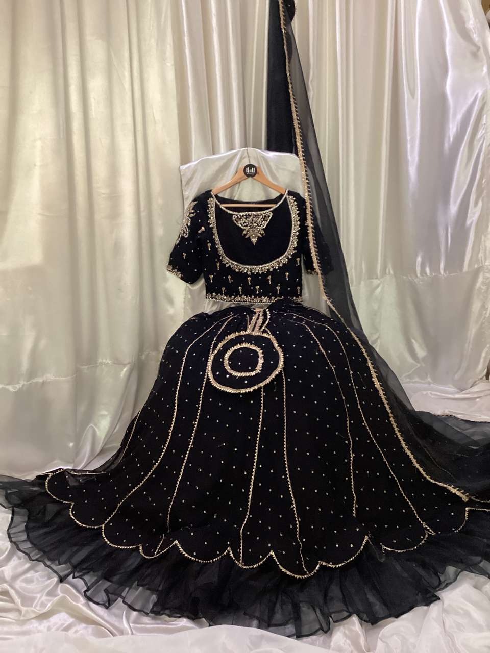 Fabric: Lehenga choli is on self embroidered chiffon fabric with hand embellished choli 250-300 inches flare with cutwork, Organza fabric dupatta with all lace with attached cancan and Potli bag