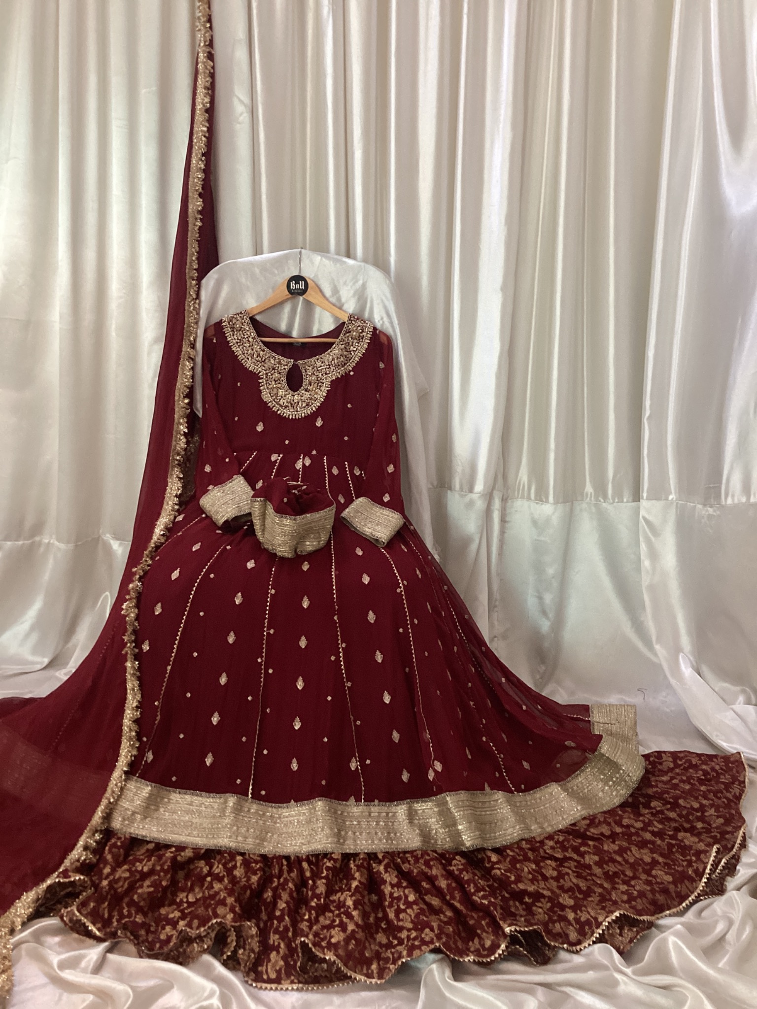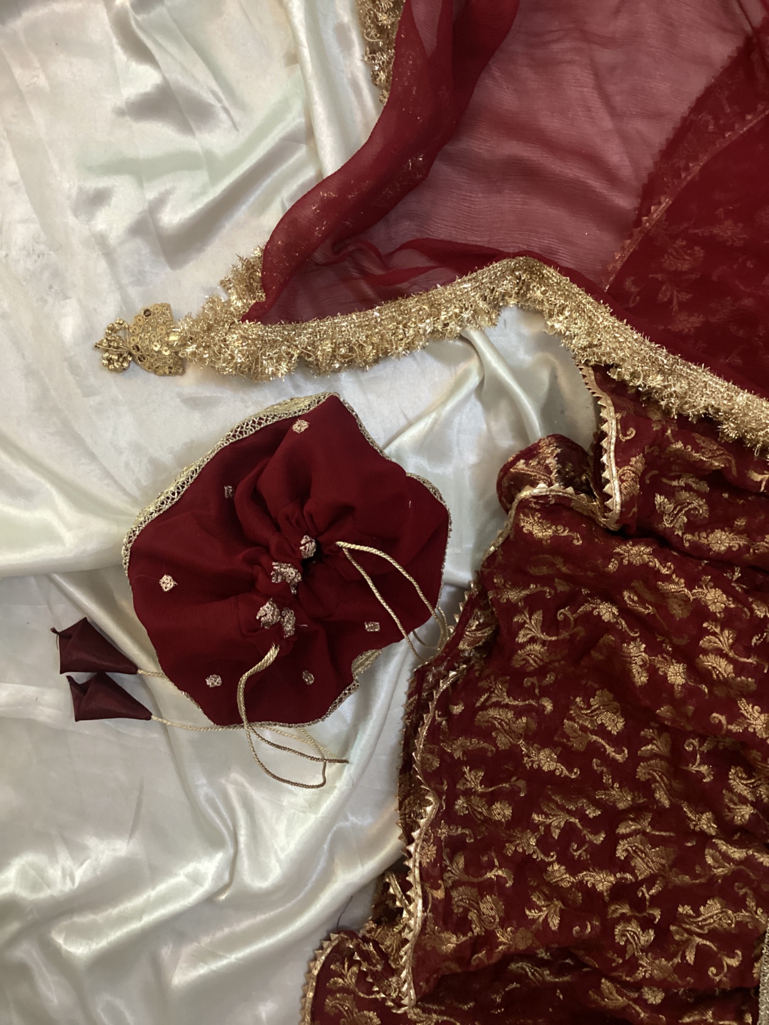 Maxi Fabric: Chiffon fabric with hand embellished neck and lehnga with pure banarsi chiffon frill, it’s a long frock with lehnga ,250-300 inches flare with laces with Potli bag with chiffon dupata