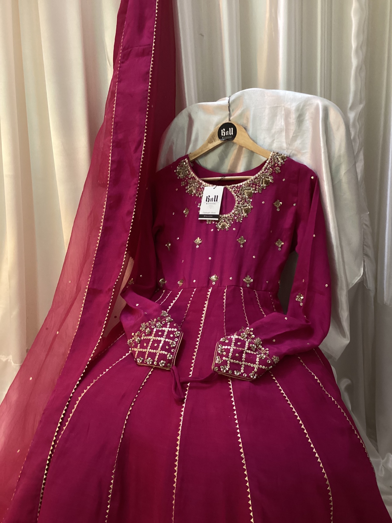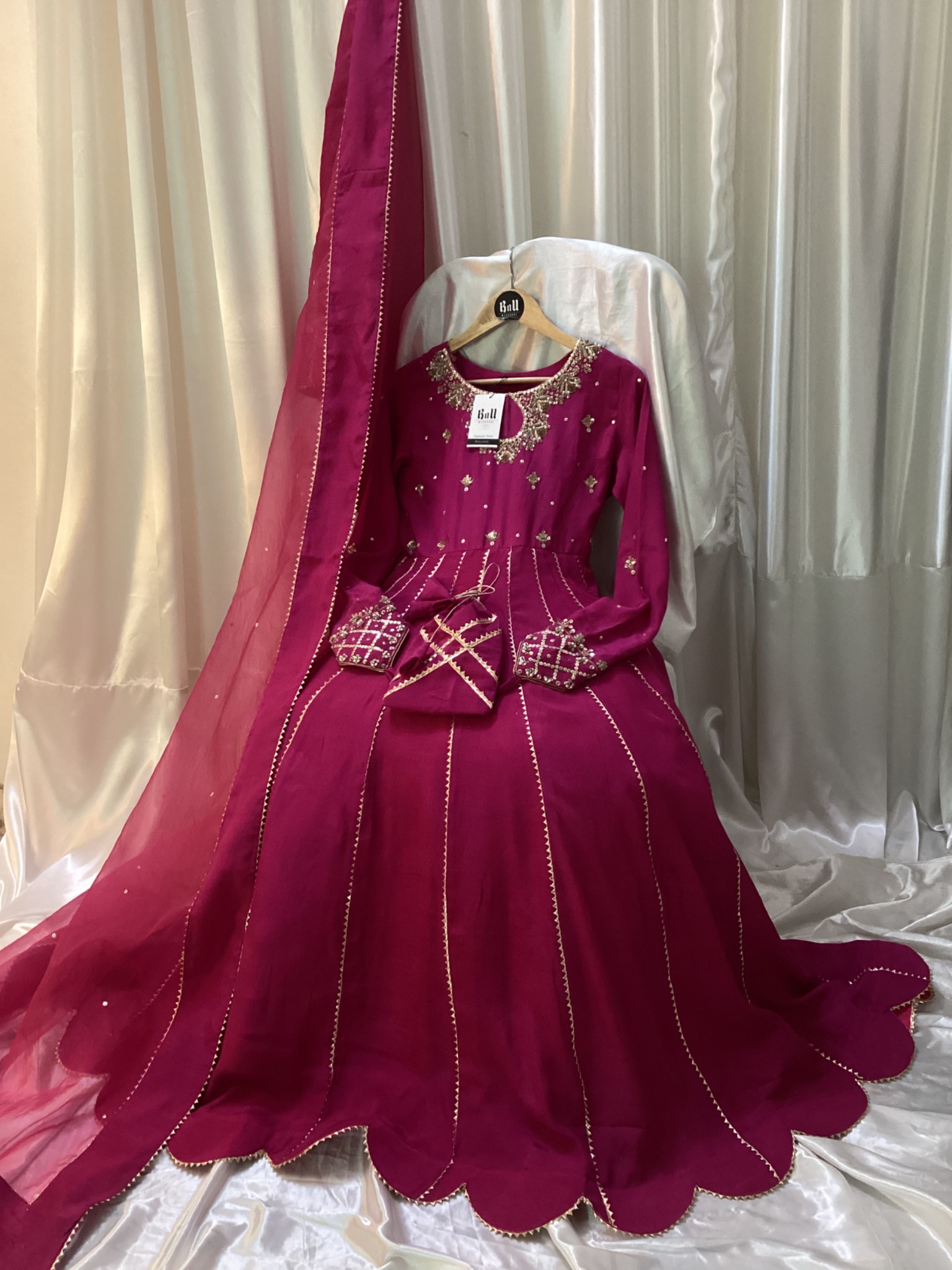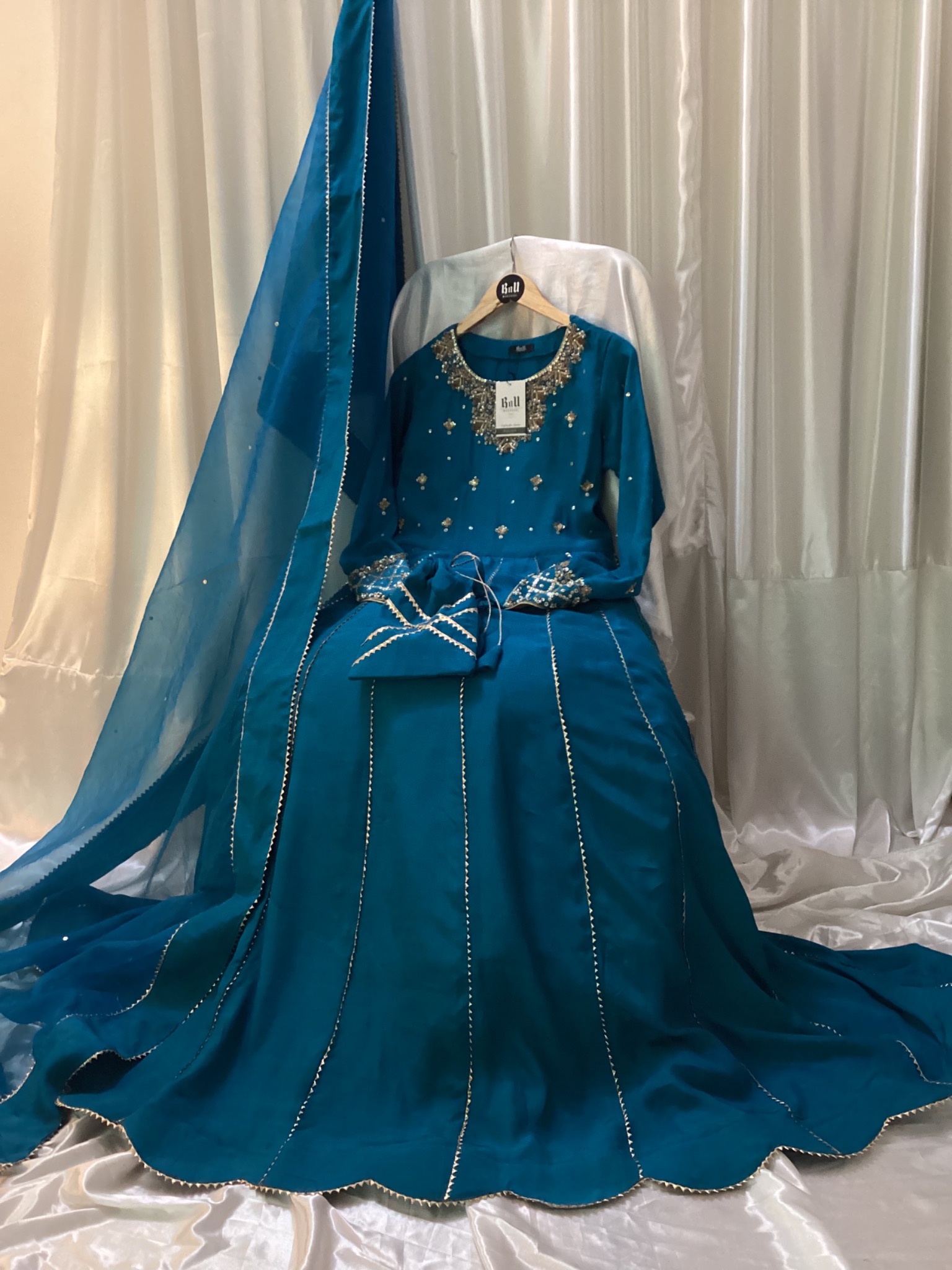 Fabric: Pure Raw Silk Maxi and pure Organza dupata with 250-300 inches flare and Hand embellishment on neck, yoke and sleeves with attached cancan and Potli bag