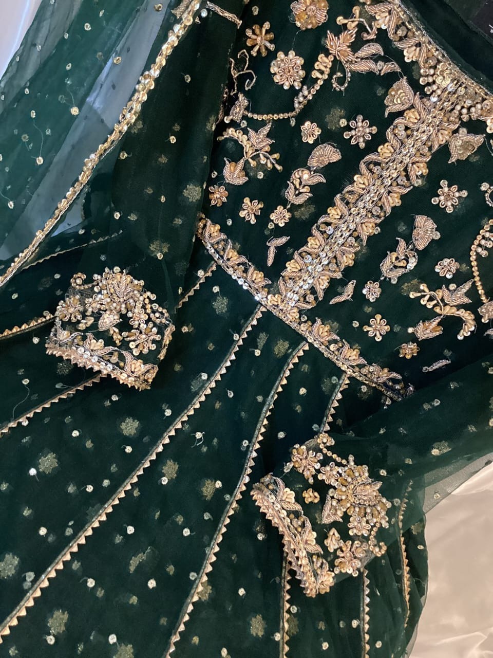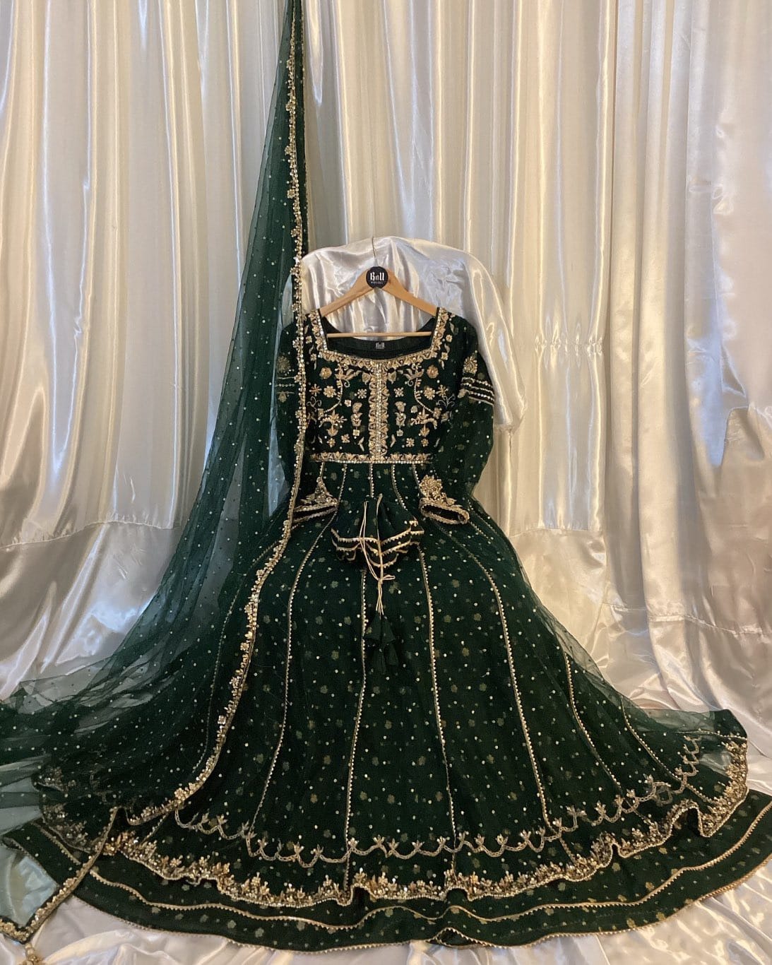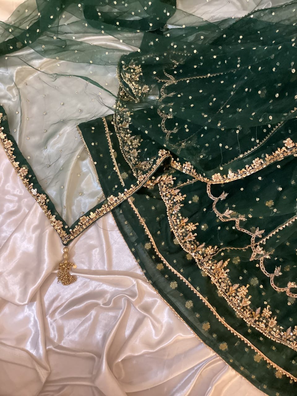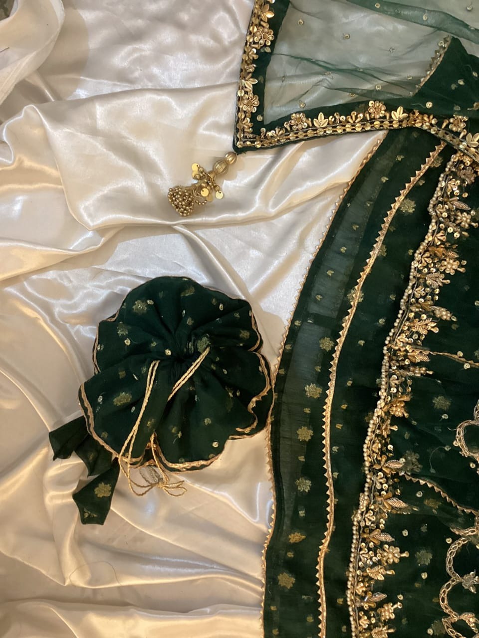 Maxi Fabric: Net fabric with hand embellishment on yoke, sleeves and flare with pure banarsi chiffon lining, dupatais on Net fabric with hand embellishment attached tussels with separate cancan with Gifted Potli bag
