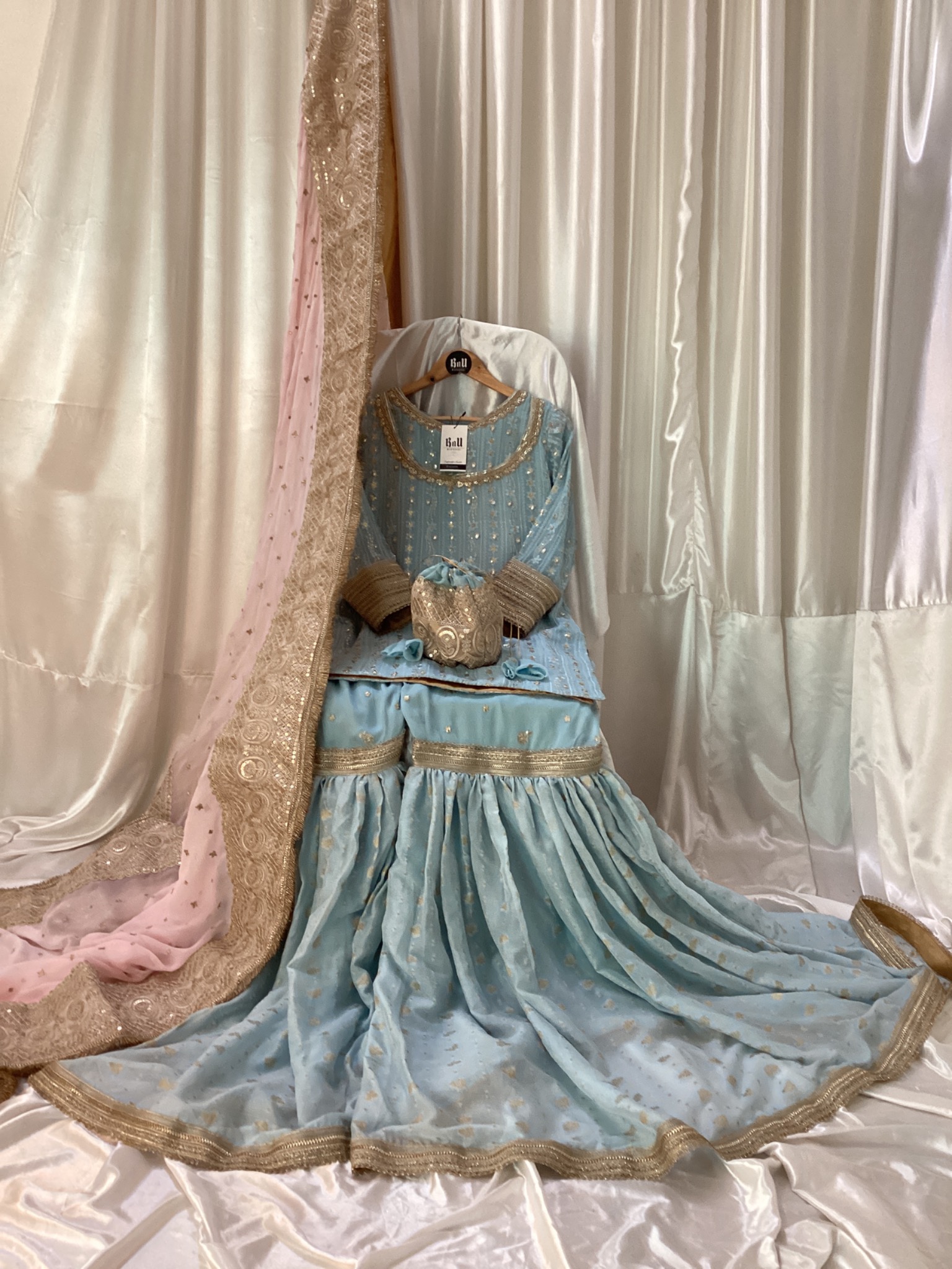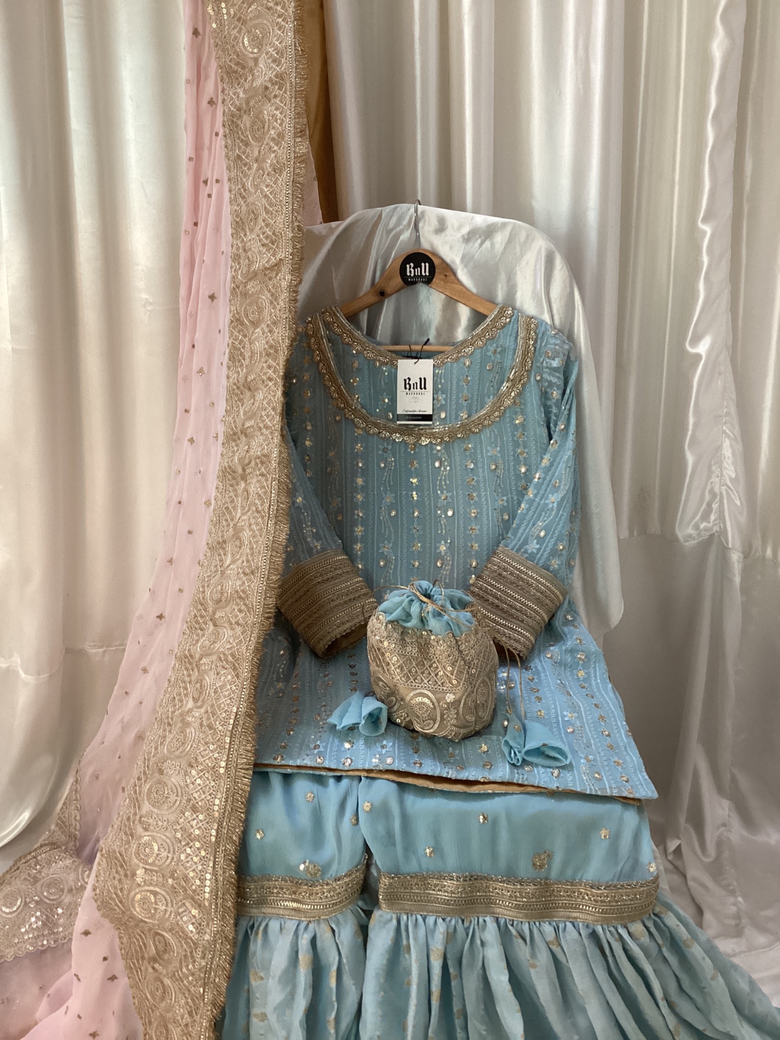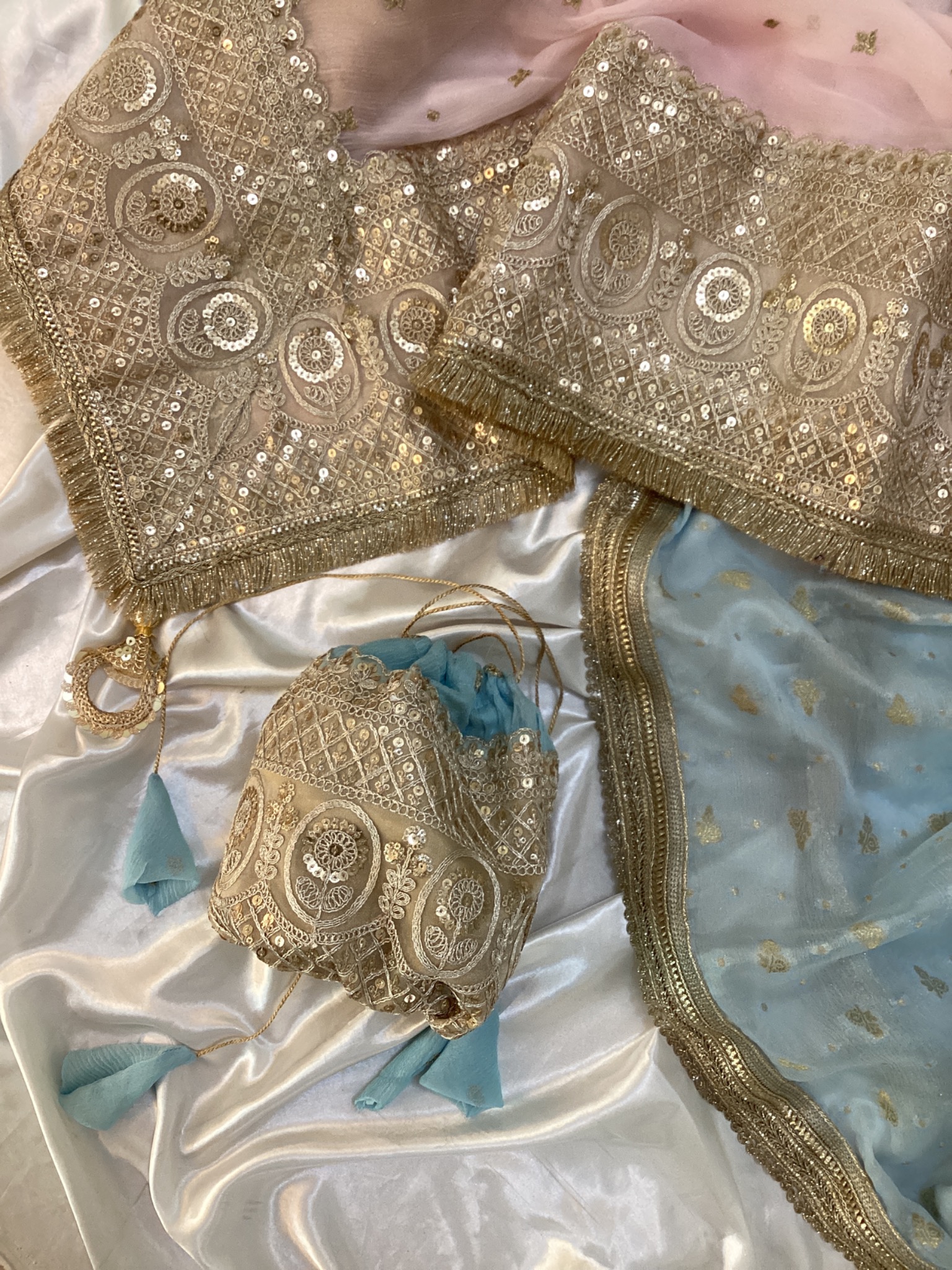 Fabric: shirt is on Chiffon fabric with pure banarsi chiffon fabric with laces and Pure Chiffon dupata with indian laces with gifted Potli bag