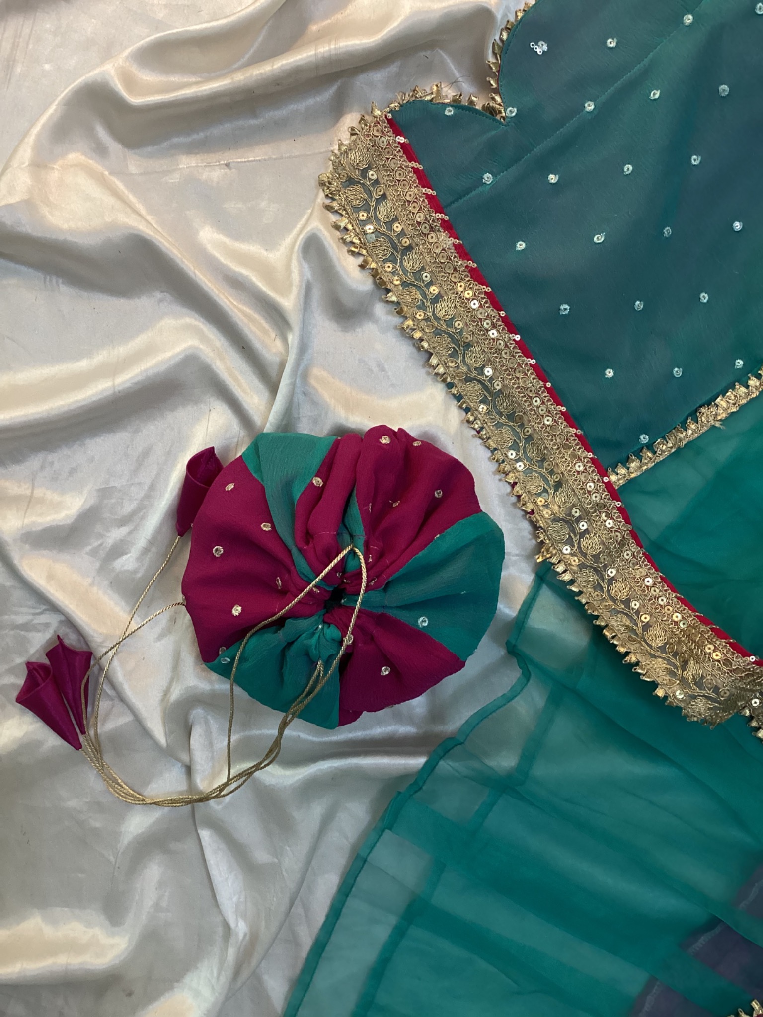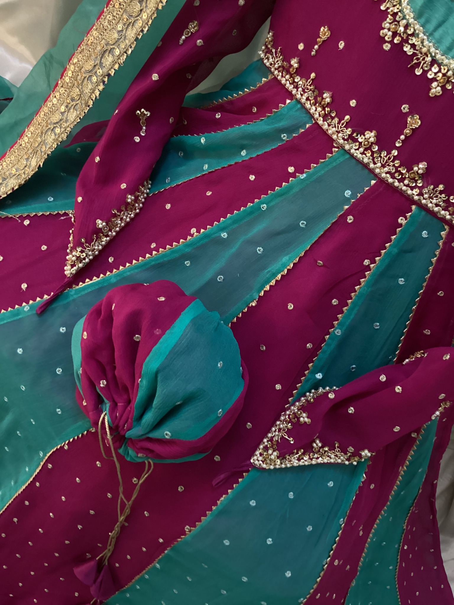 Fabric: Maxi is on pure Chiffon fabric with hand embellished work on yoke and sleeves with pure organza frill and dupata is on Pure Organza Fabric with laces included Potli bag