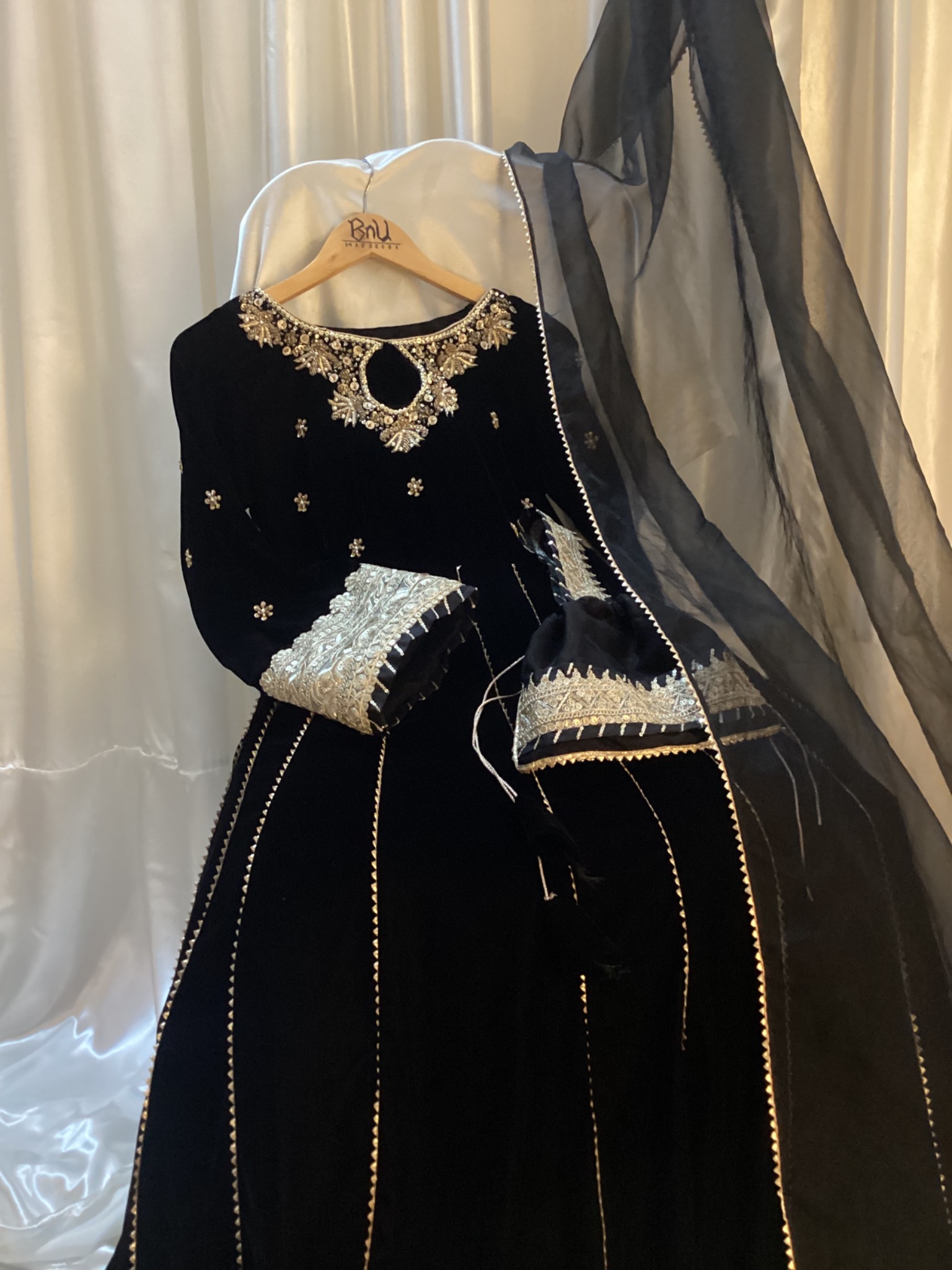 It’s on pure Velvet fabric with 200-250 inches flare with attached cancan and Potli bag and dupata is on Pure Organza Fabric