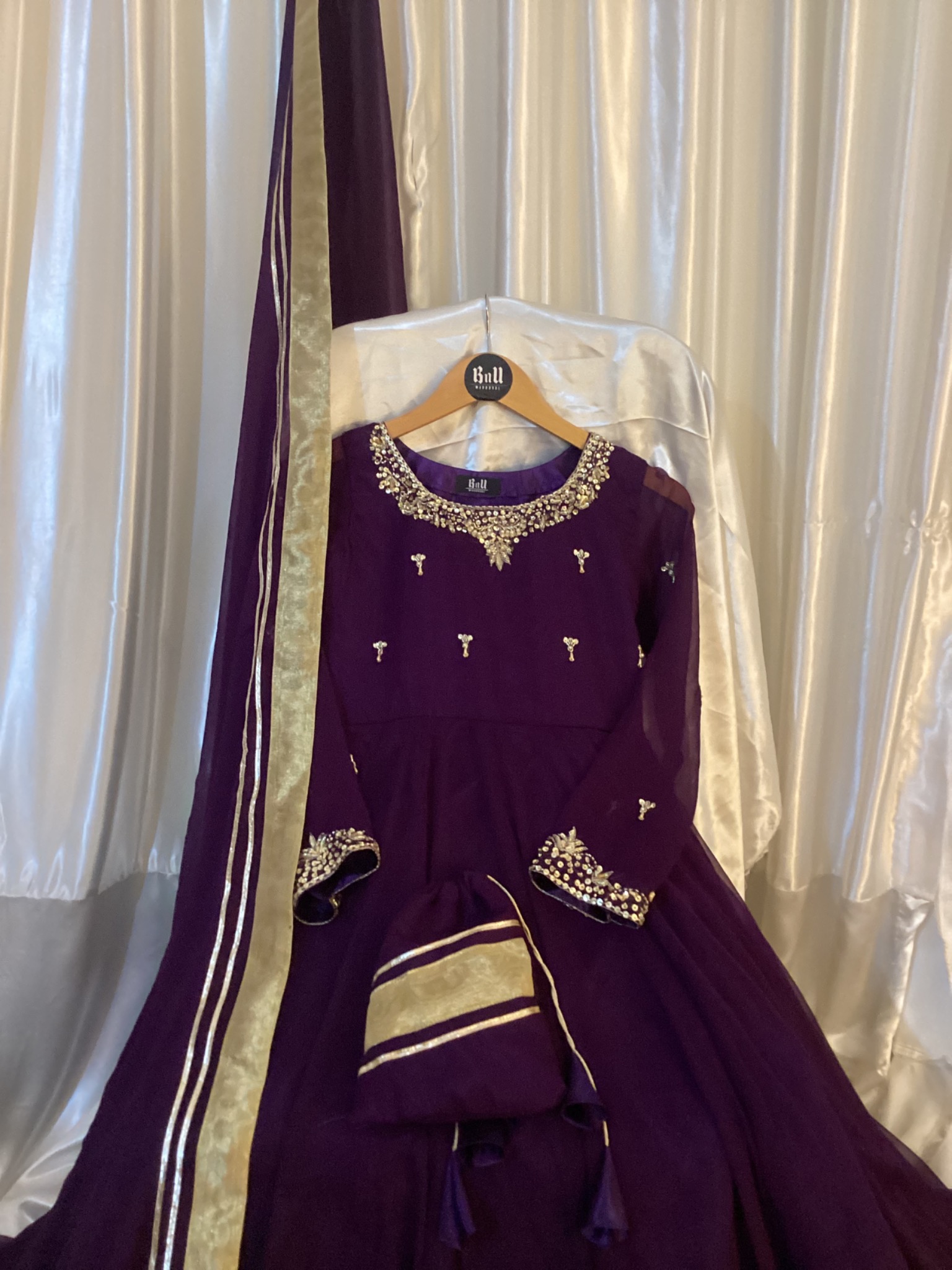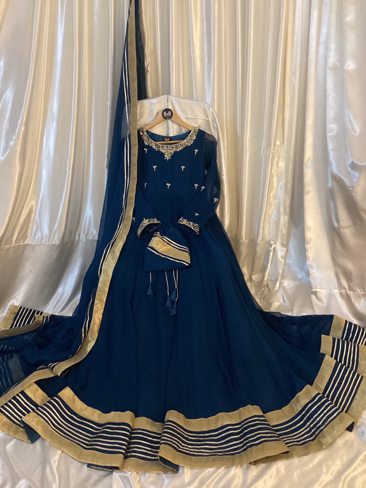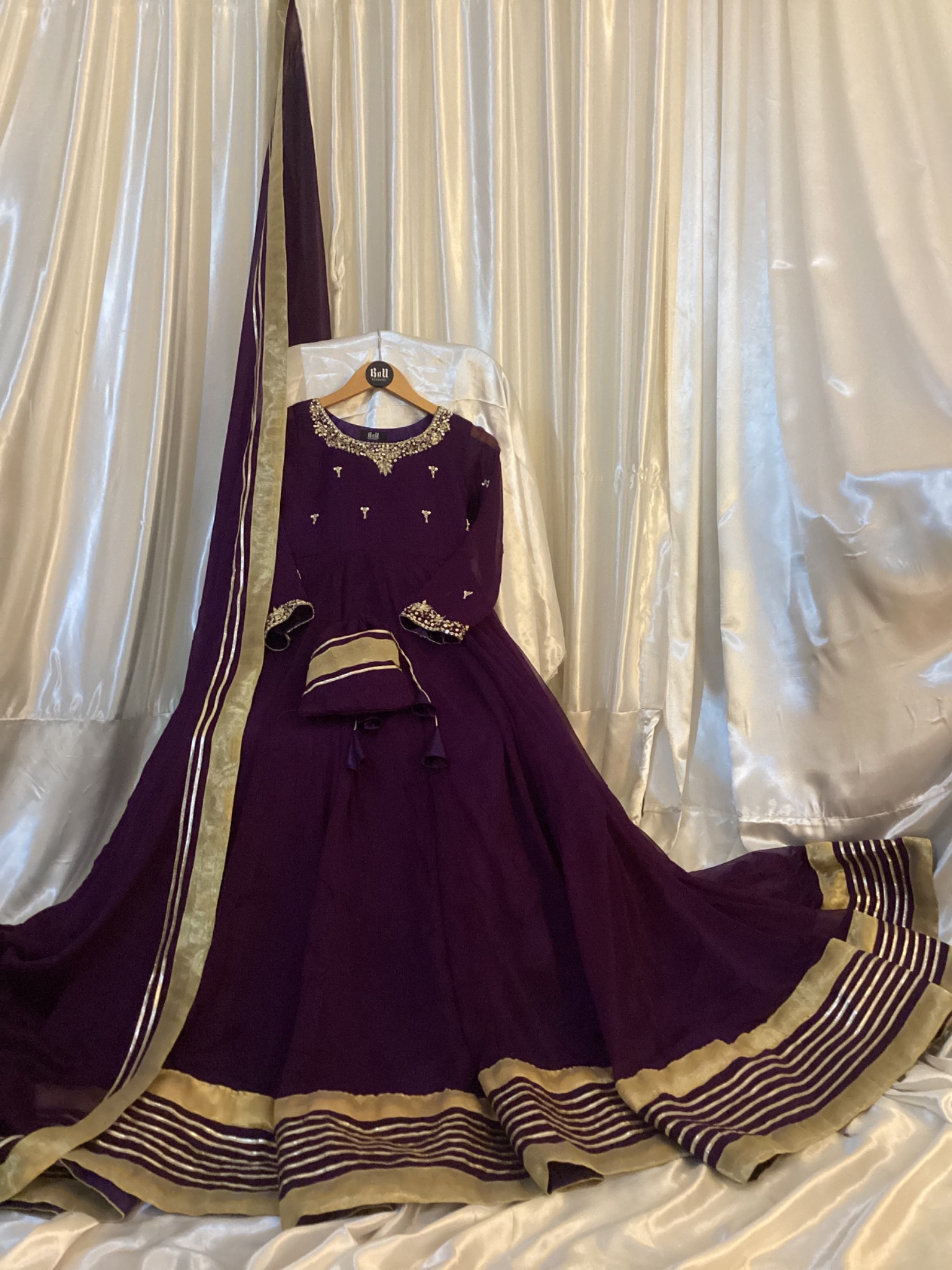 Fabric: Chiffon fabric with 400-500 inches flare with hand embellishment on sleeves and neck with attached cancan and Potli bag