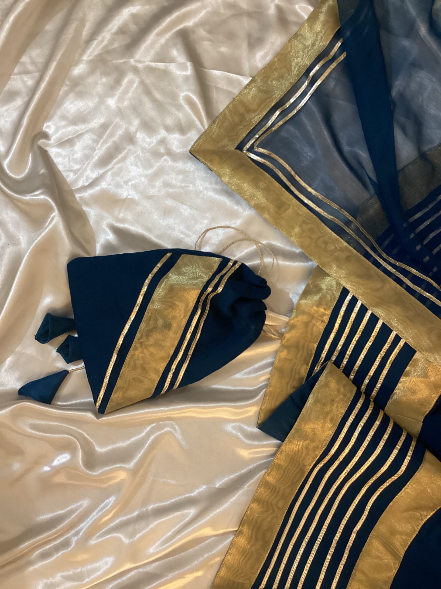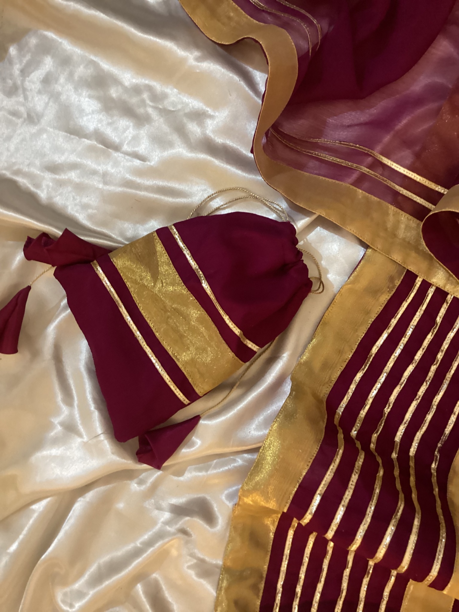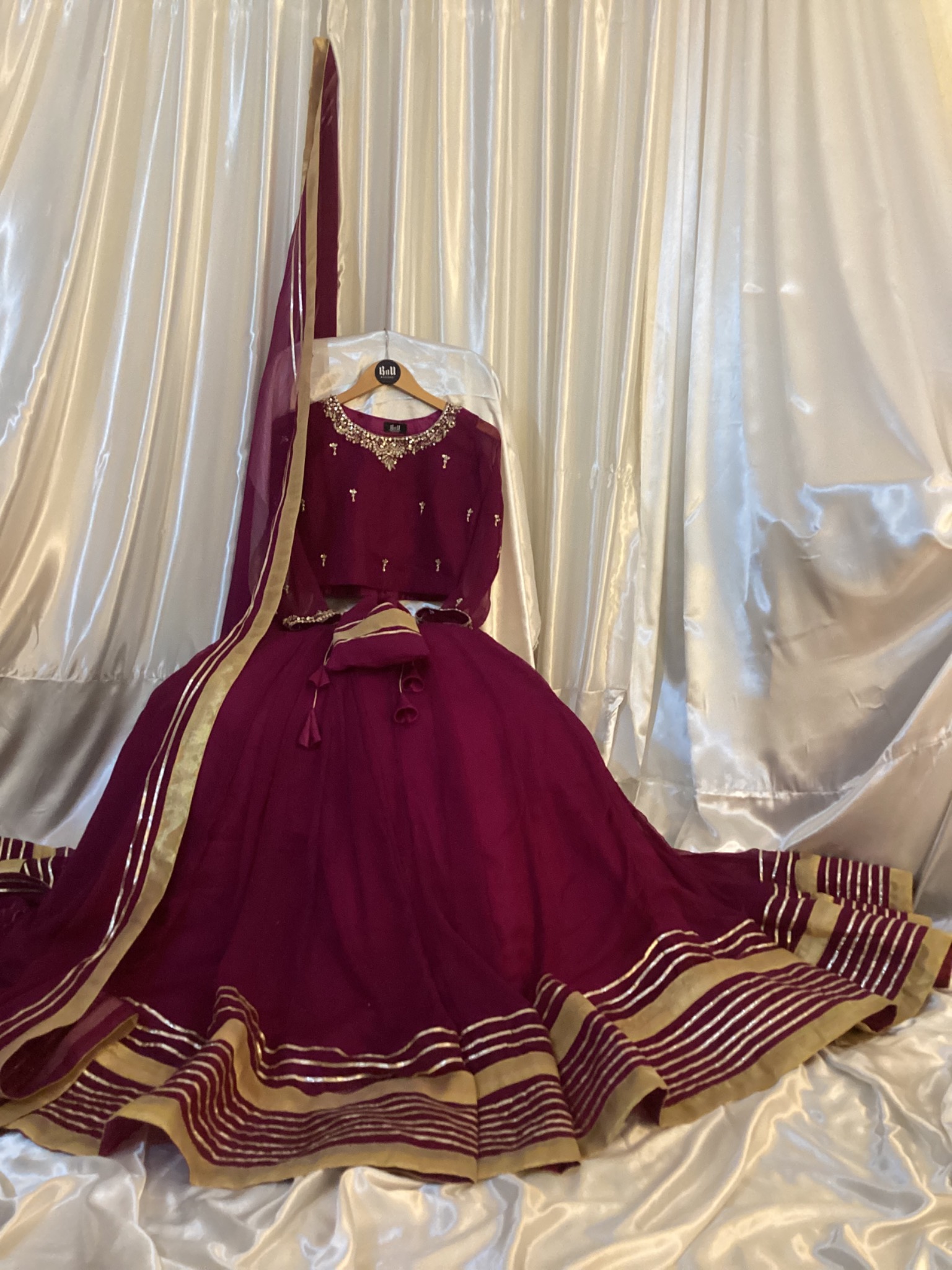 Fabric: Chiffon fabric with 400-500 inches flare with hand embellishment on sleeves and neck with attached cancan and Potli bag