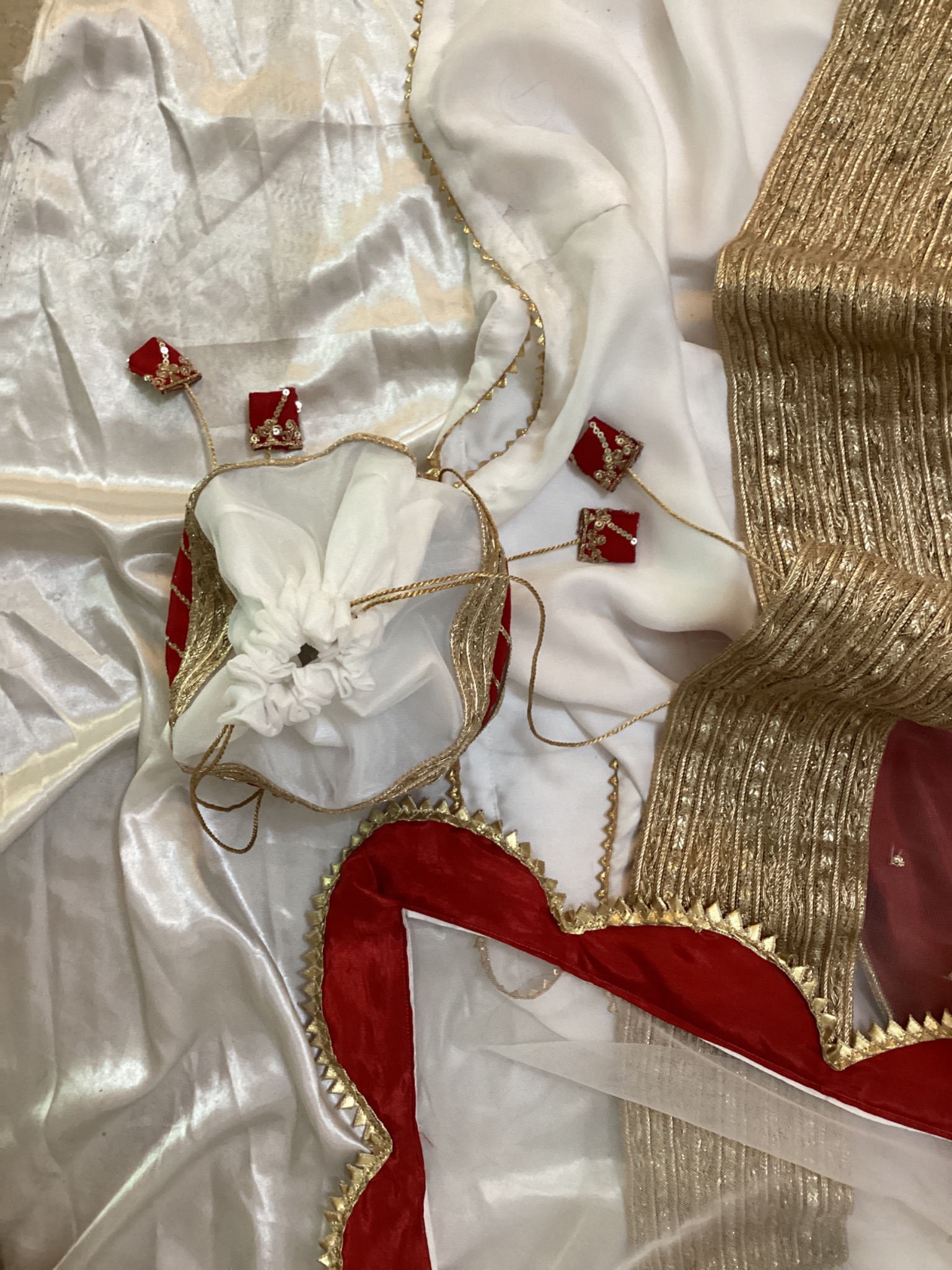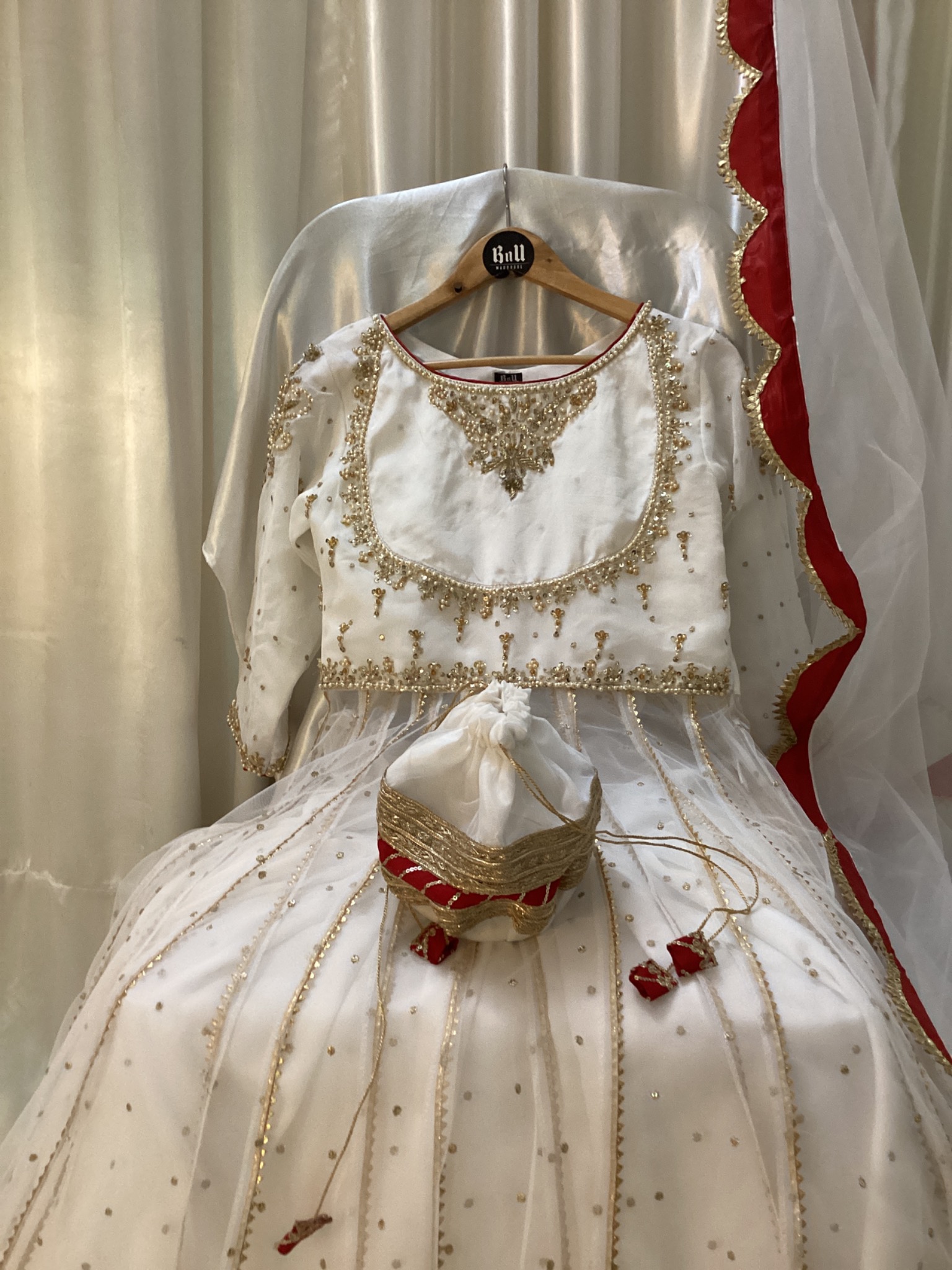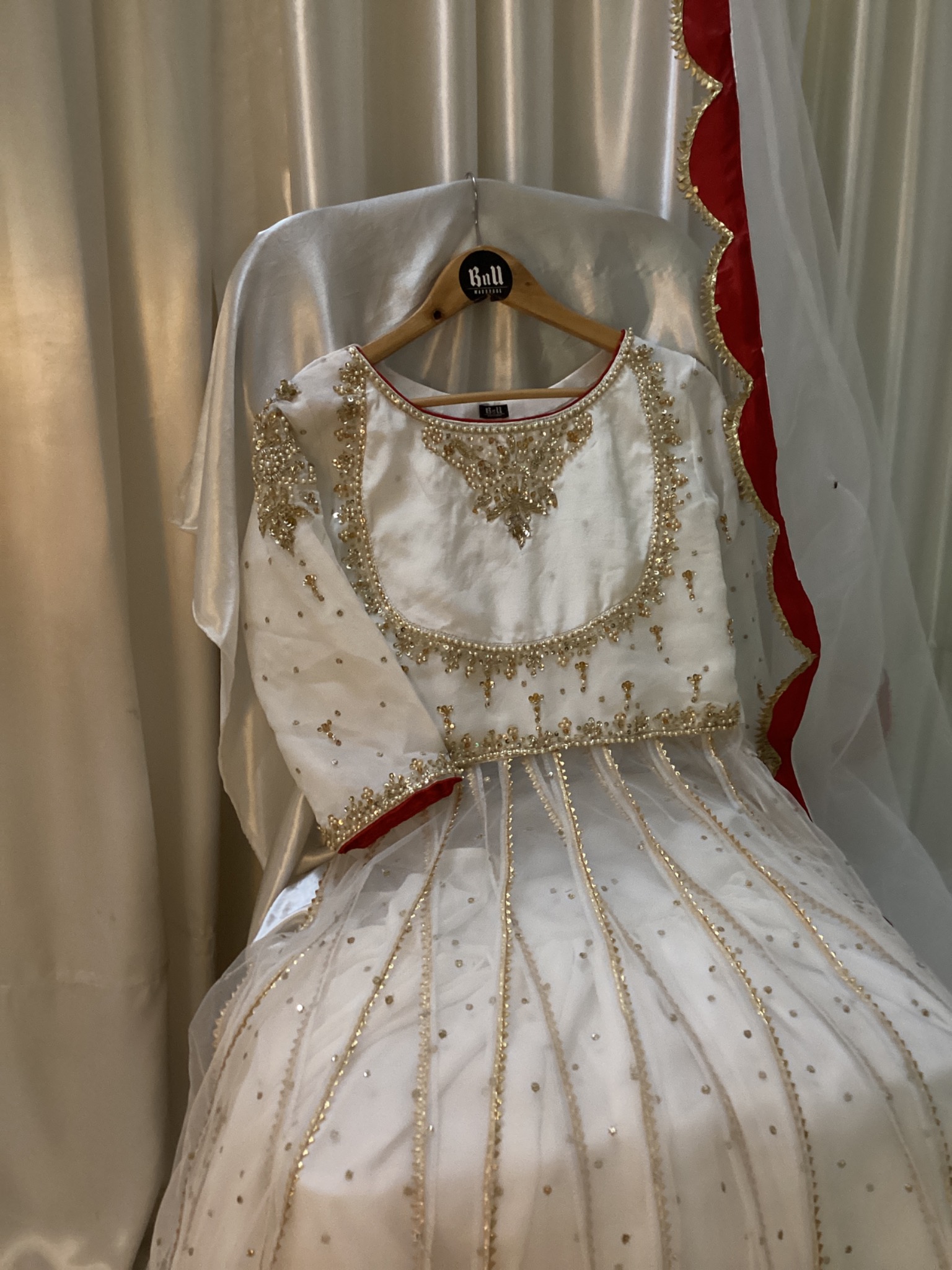 It's a double layer article, with net embellished maxi with shamoos silk frock as a lining with 300-350 inches flare with hand embellishment on yoke and sleeves and Net dupata with cutwork