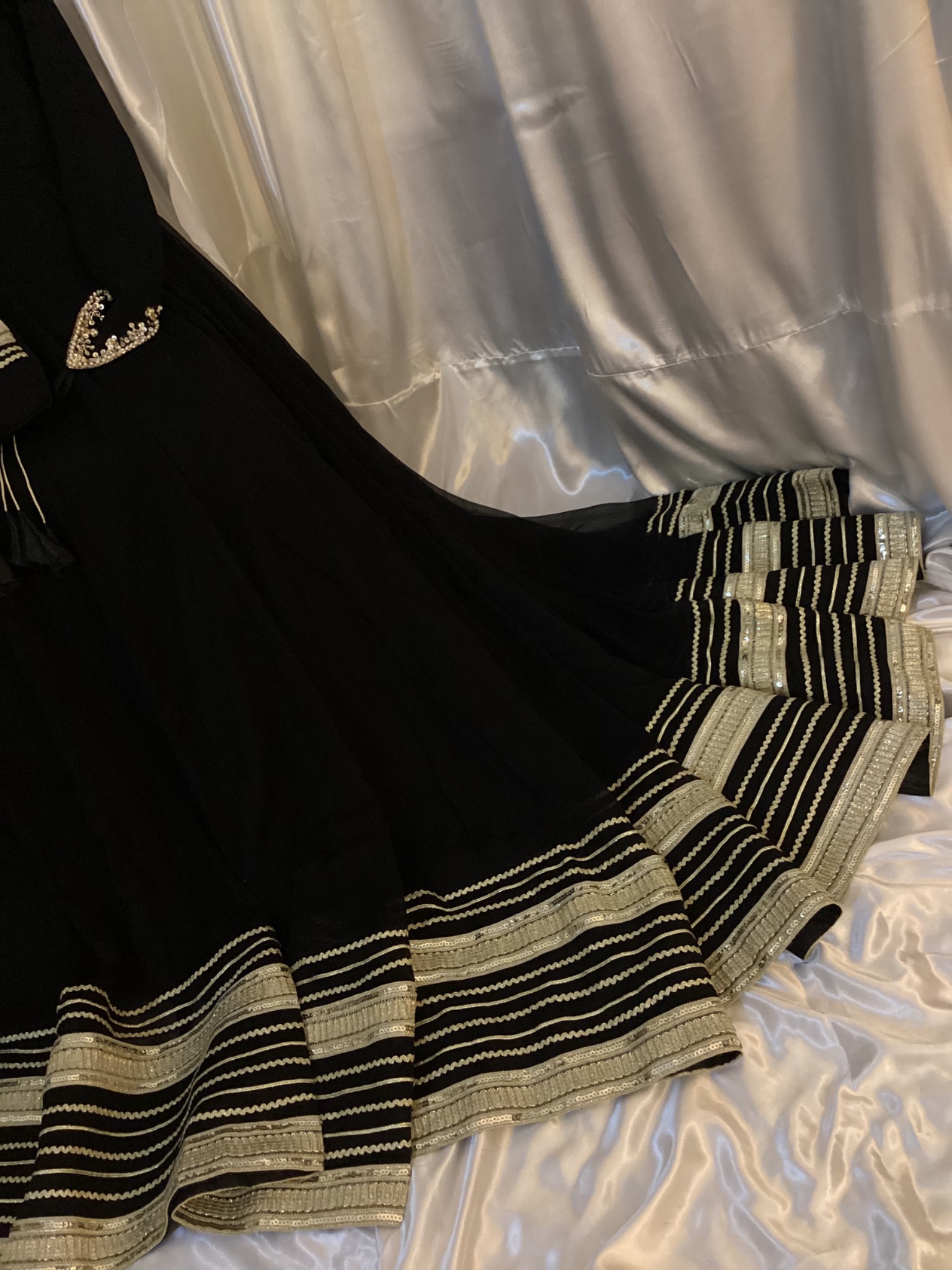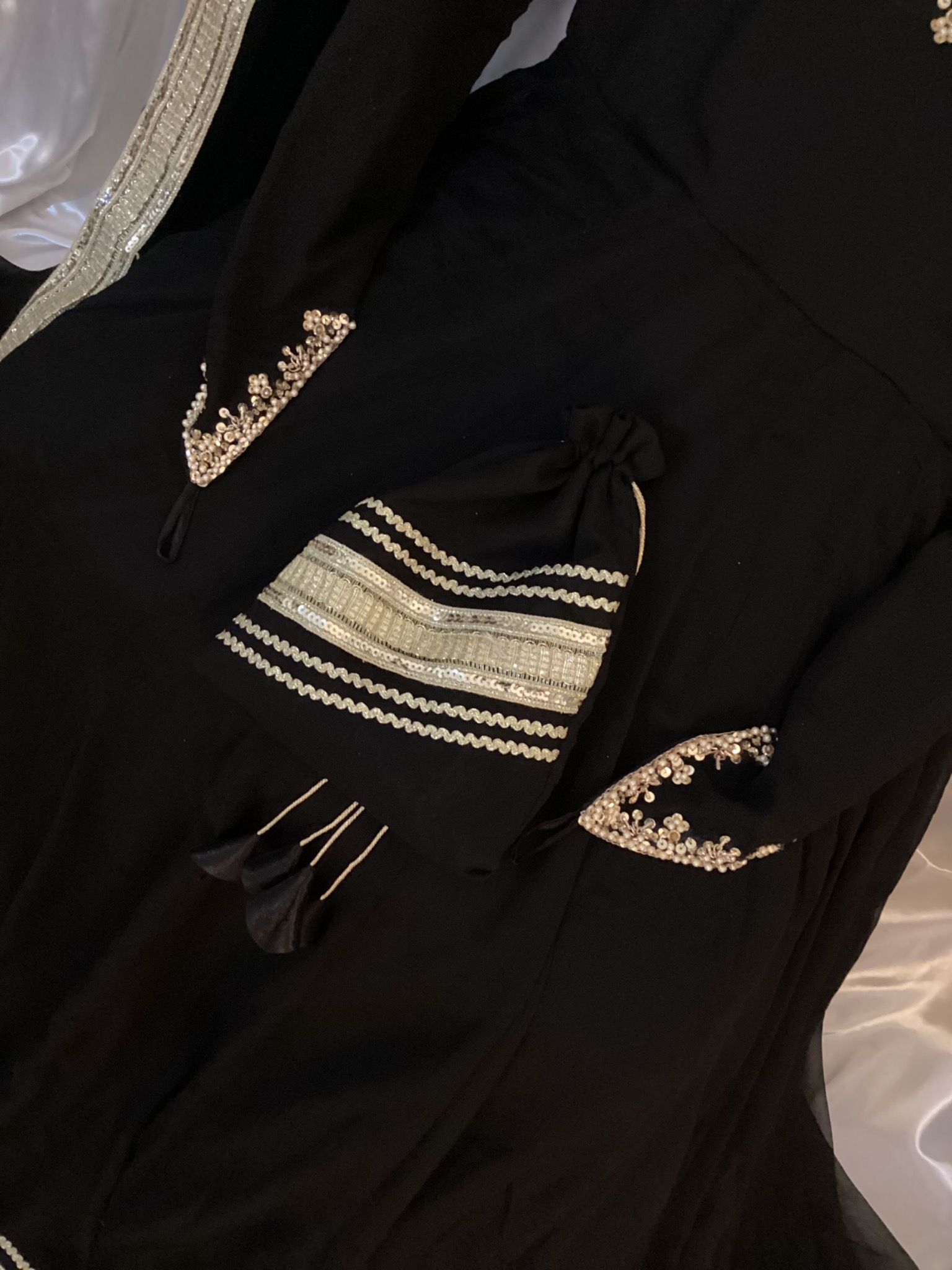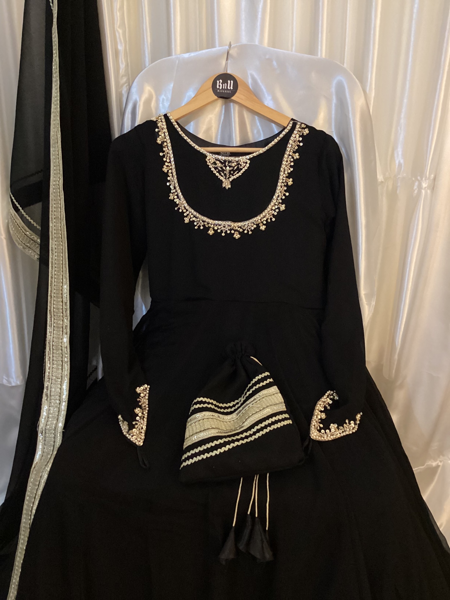 Chiffon fabric Maxi and dupata with 400-500 inches flare with hand embellishment on sleeves and neck with attached cancan and Potli bag