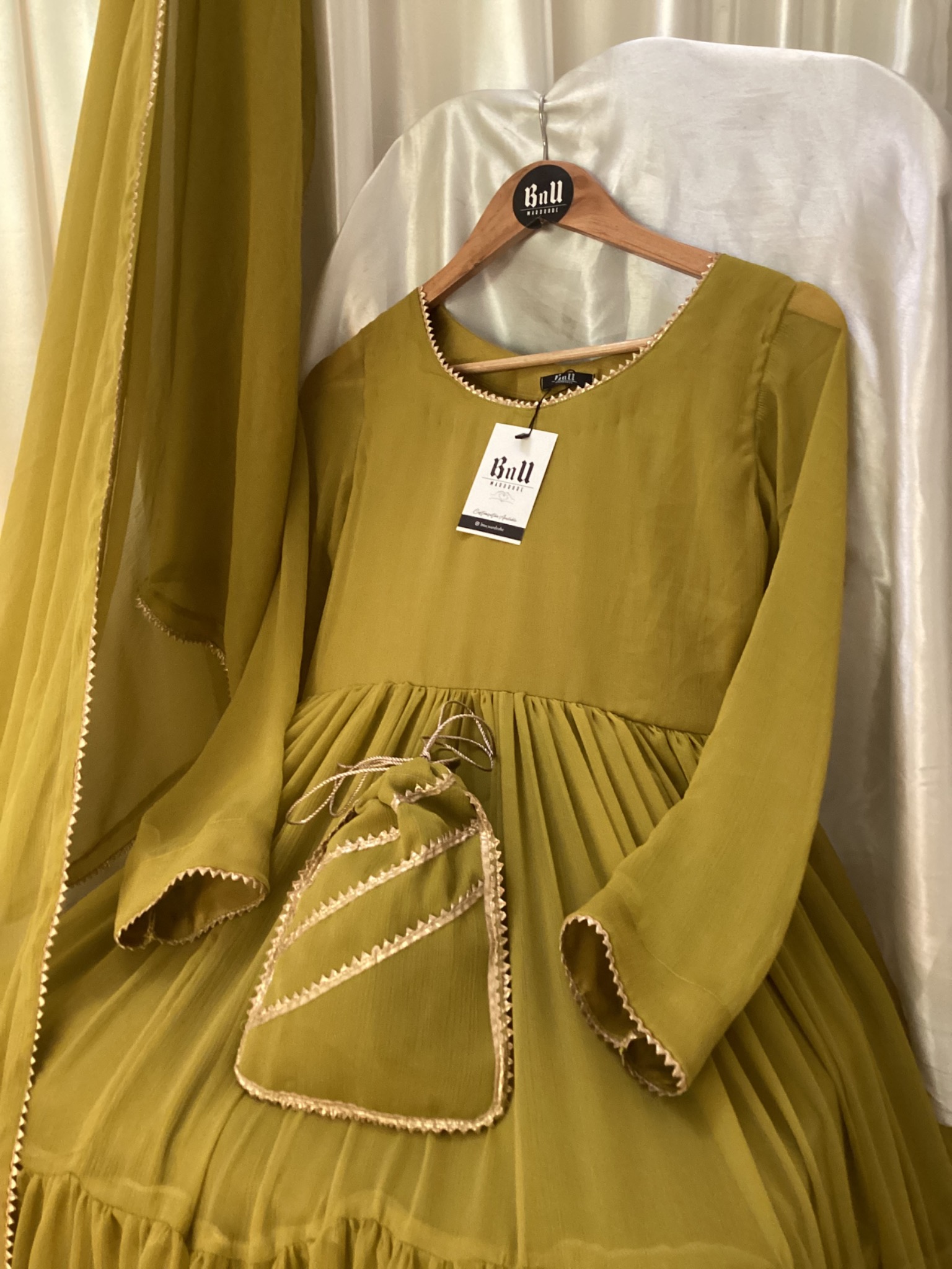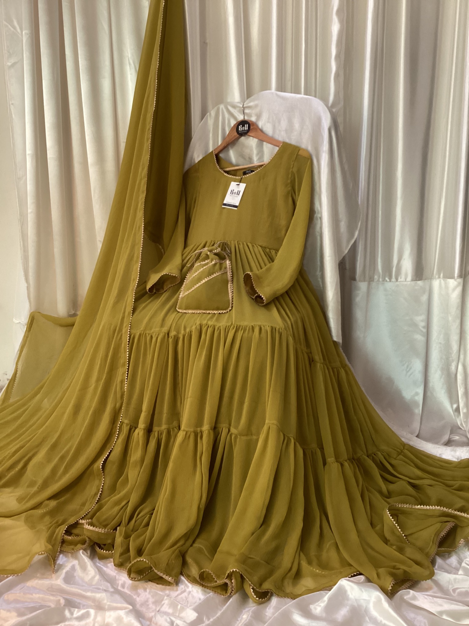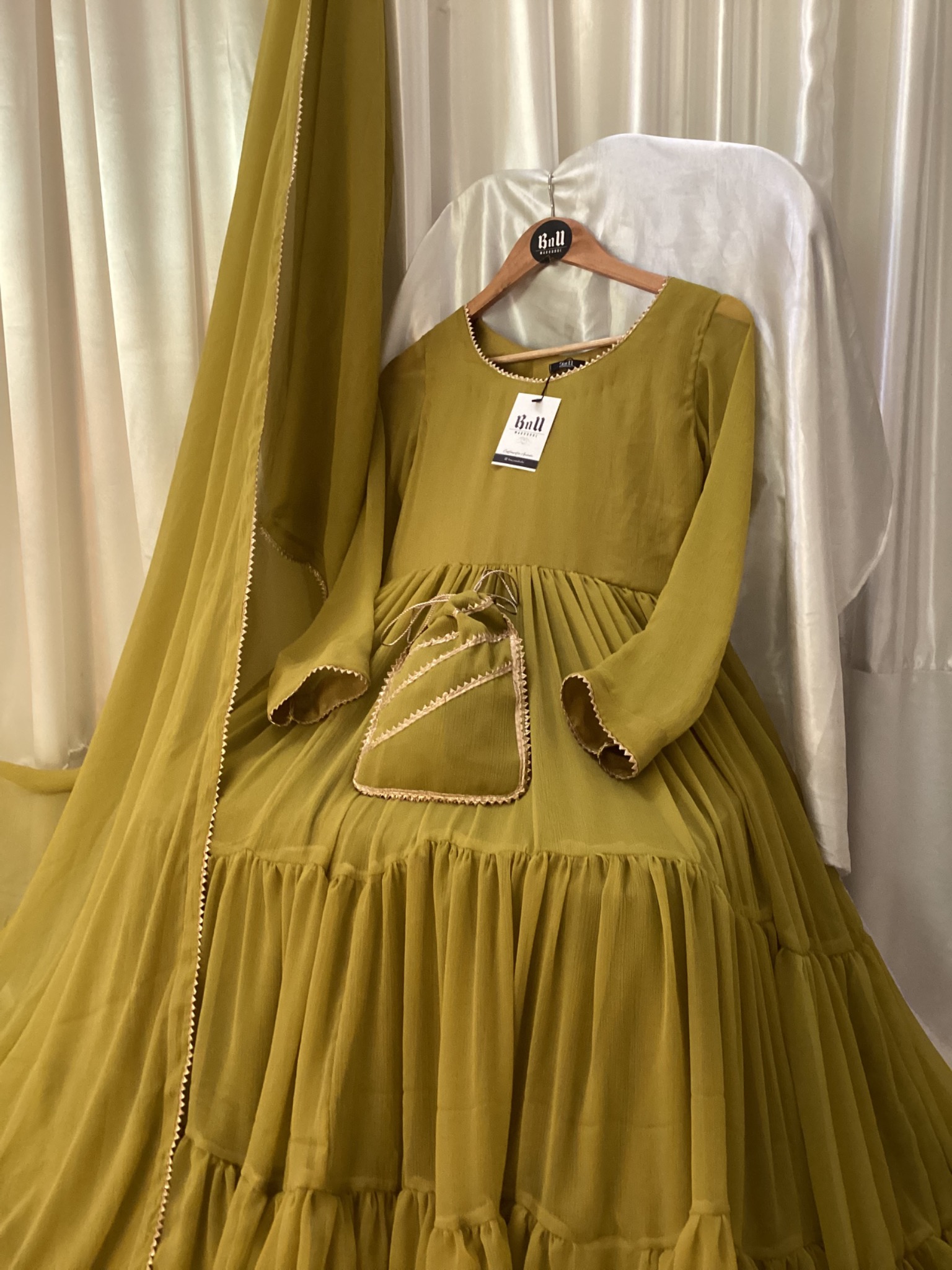 It’s a chiffon fabric with 400-500 inches flare with hand embellishment on sleeves and neck with attached cancan and Potli bag