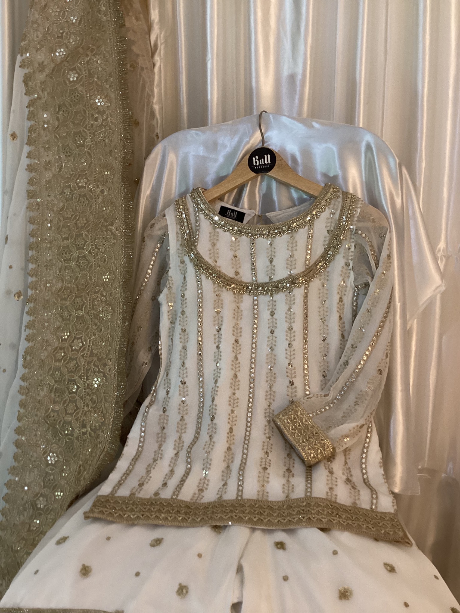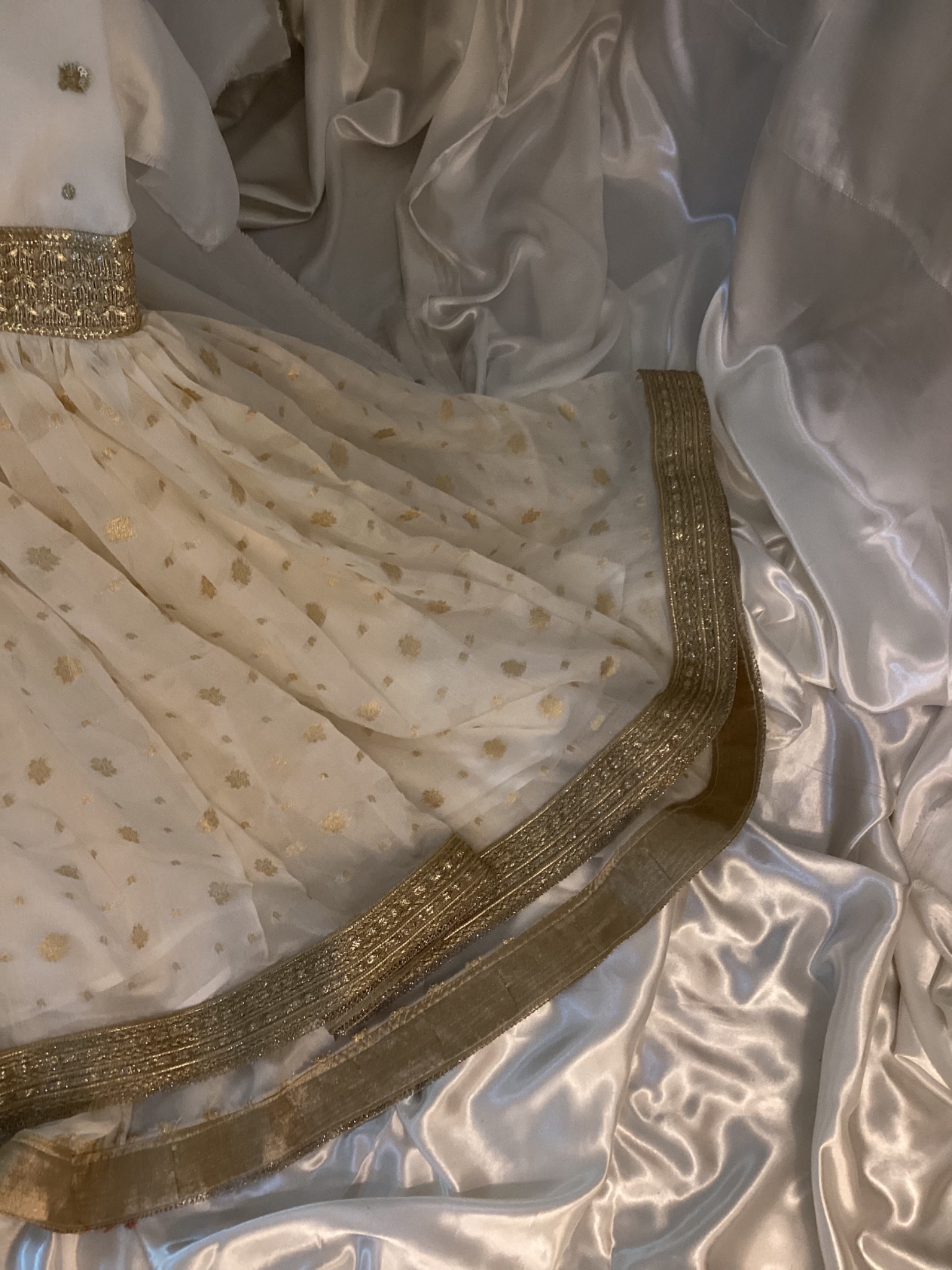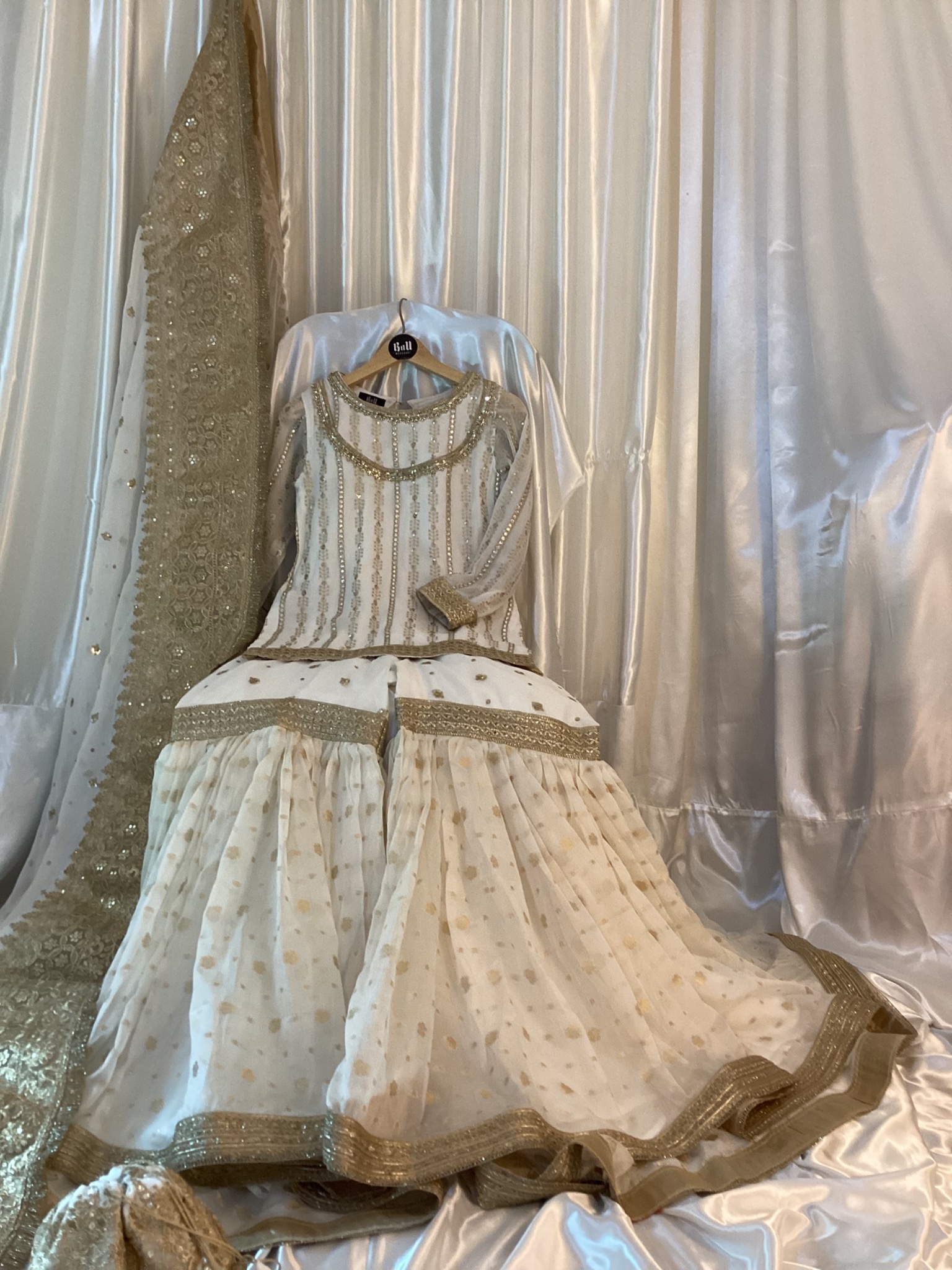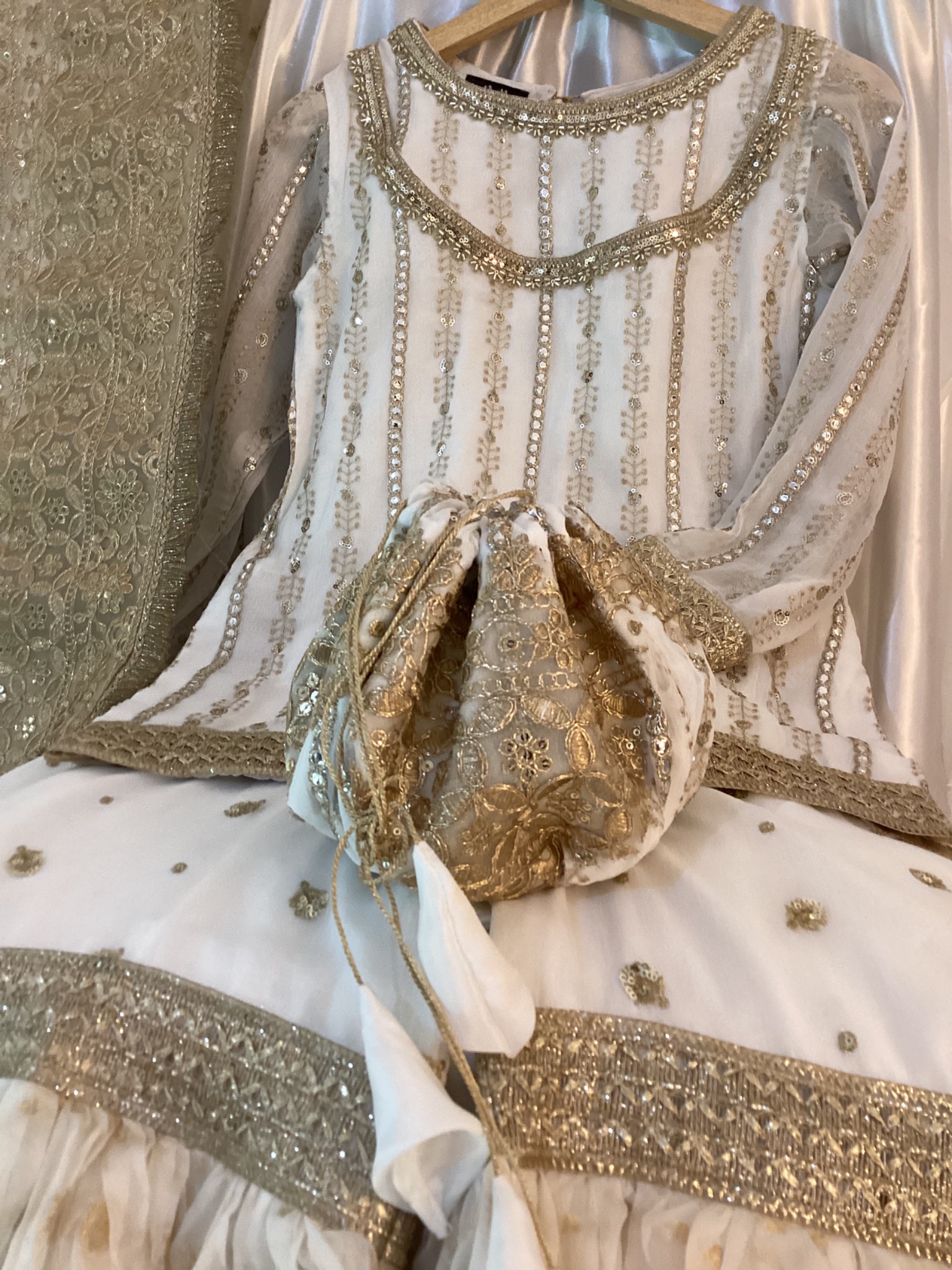 Fabric: Shirt is on pure Chiffon fabric with pure banarsi chiffon gharara with laces with Potli bag and dupata is on Chiffon fabric with indian laces and tussels